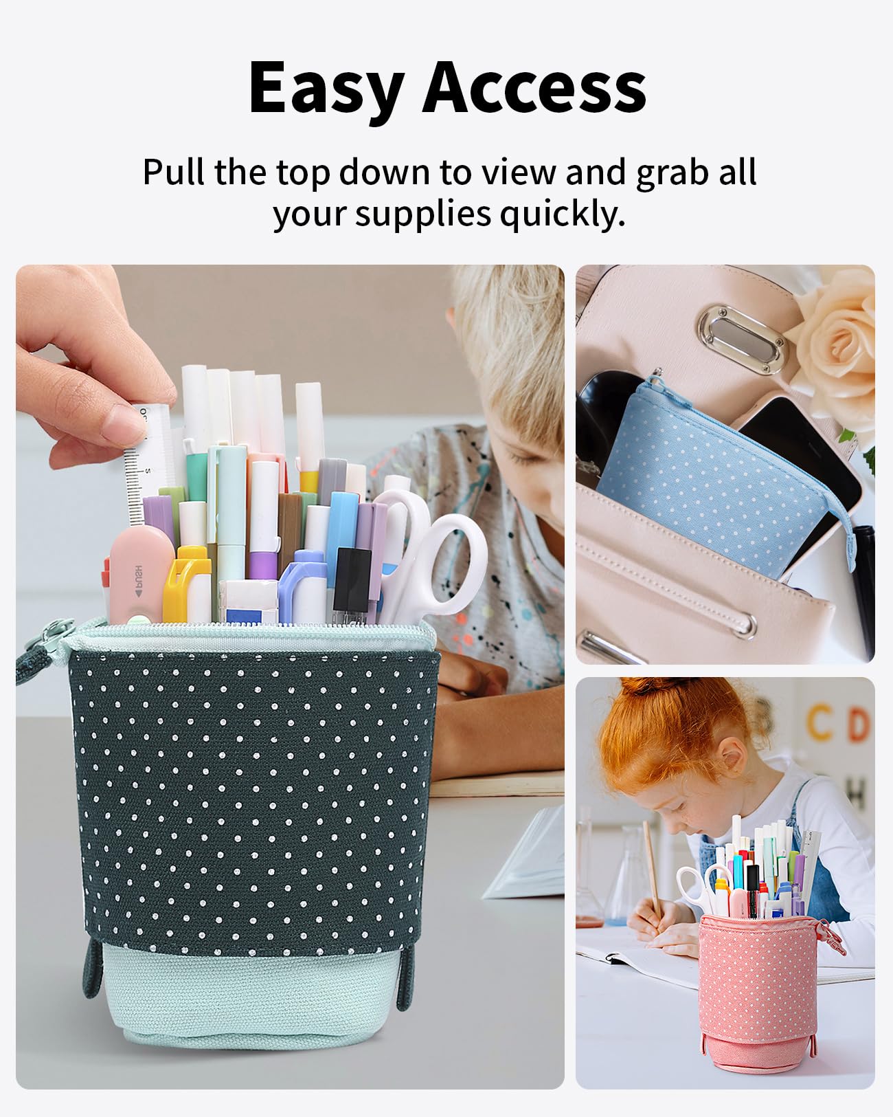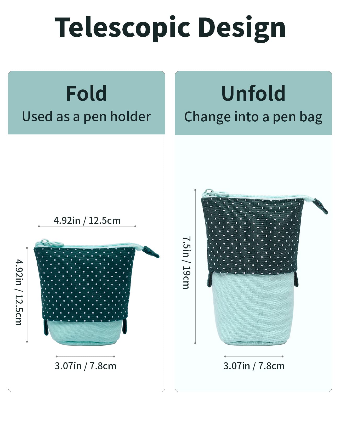Retractable & Convenient: Put the bag on the table, unzip and pull down the two side tabs to transform it into a pen holder for easy access. The sturdy base gives it good support to stand upright, keeping all your supplies visible and easy to grab.
