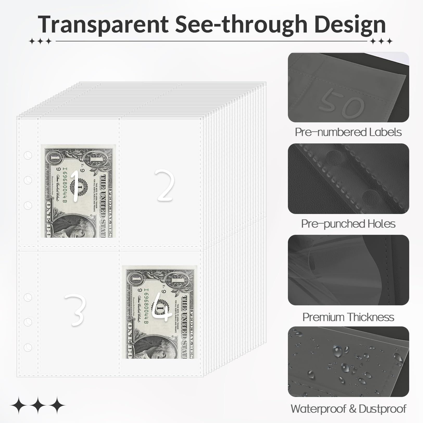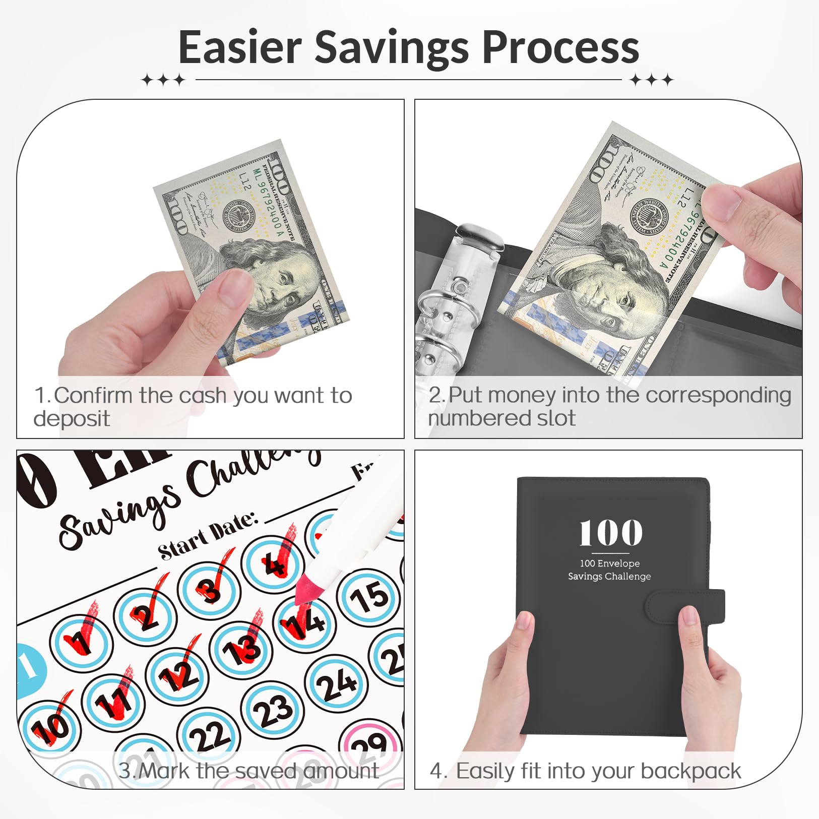 Superior Material: Thickened PU Leather savings binder is scratch-resistant and sturdy. 100 transparent PVC cash envelope slots, pre-printed clearly with 1 to 100, waterproof and tear proof, keep and secure your money
