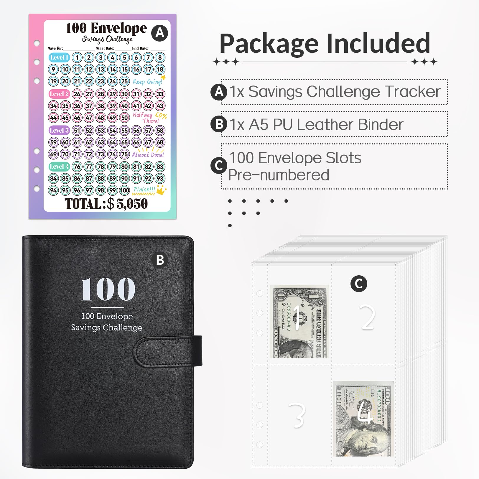 Money Savings Challenge Kit: 1 A5 PU leather binder, savings tracker for marking, and 25 transparent cash envelopes pre-numbered with 1 to 100. Sooez money saving binder helps you build up an emergency savings fund and cultivates a saving habit throughout the save money challenge.
