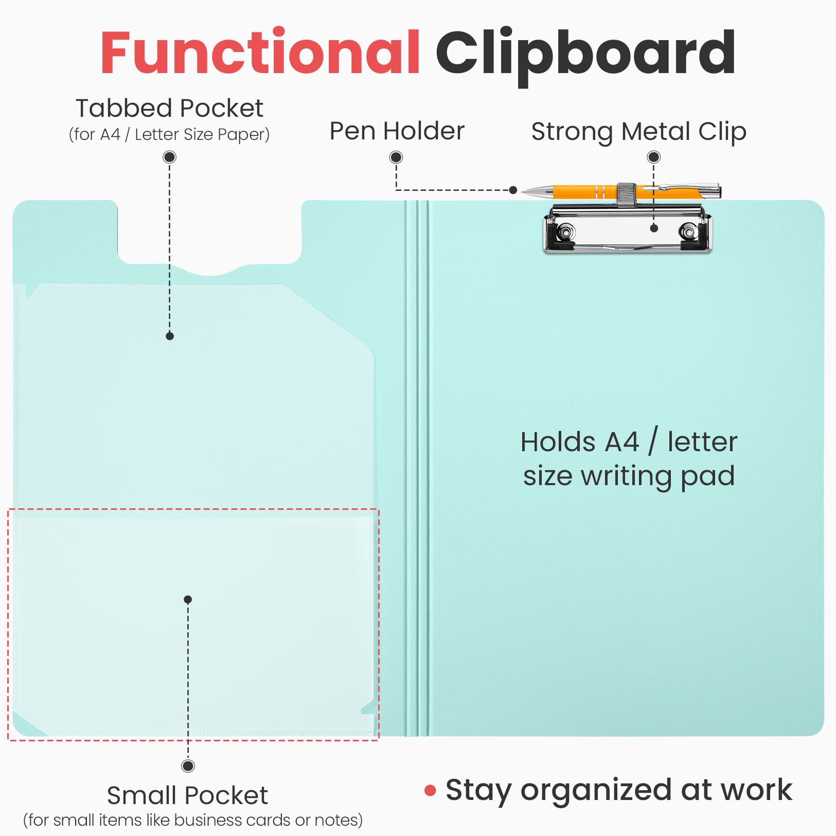 Tabbed Pockets & Low Profile Clip: Includes one tabbed pocket on the left for separating temporary files, documents, and a small pocket for business cards or small notes. Equipped with a robust metal low profile clip, it firmly holds 100 letter size / A4 size pages / legal pads, keeping documents neatly organized and firmly in place