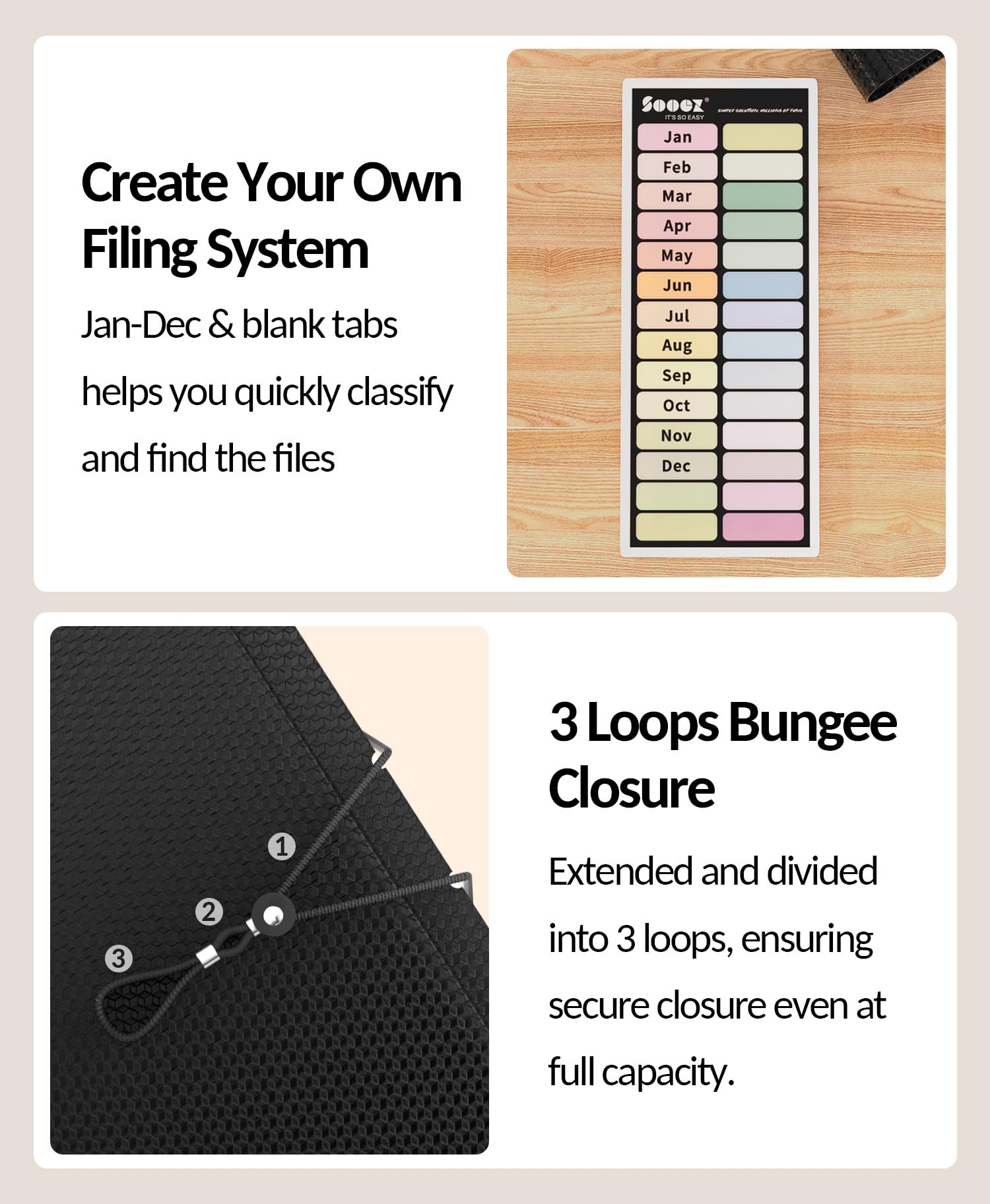 Sticky Labels & 3 Loops Bungee Closure: Colorful monthly tabs and labels help you locate the target object at a glance and manage monthly tasks with ease. The elastic band closure with three loops expands generously to accommodate all your storage needs