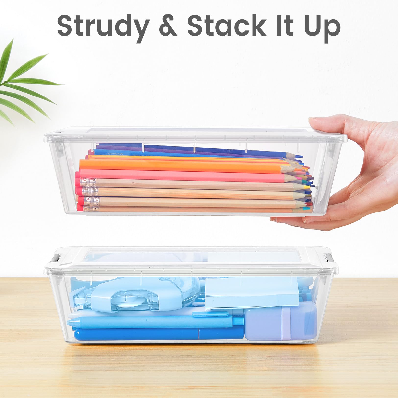 Stackable & Portable Design: The stackable design of the storage box makes it easy to organize, save space and keep desks neat when stacked. The slim, space-efficient shape fits easily into most desks, drawers as well as backpacks and briefcases.