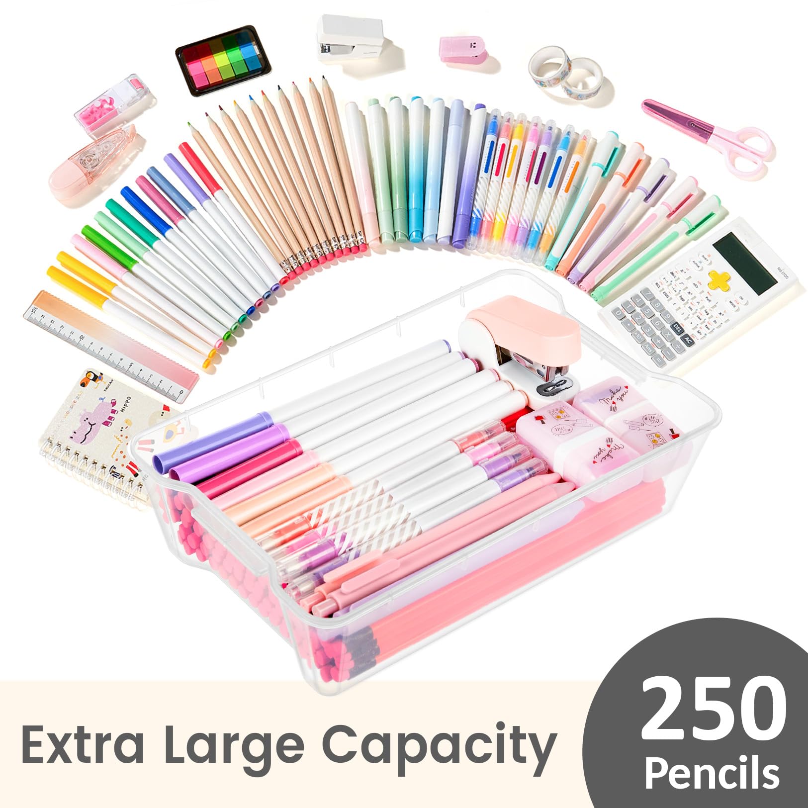 Large Pencil Boxes: Sized (L)9.3in x (W) 5.9in x (H)2.7in. Interior Dimensions: 7.8"L x 4.9"W x 2.4"H. This hard pencil box is deeper than the standard pencil case. It holds a lot of pens in the bottom. Comes with 6 pack stackable pencil boxes, holds 250+ pencils, 100+markers, 200+ crayons, and the other accessories.
