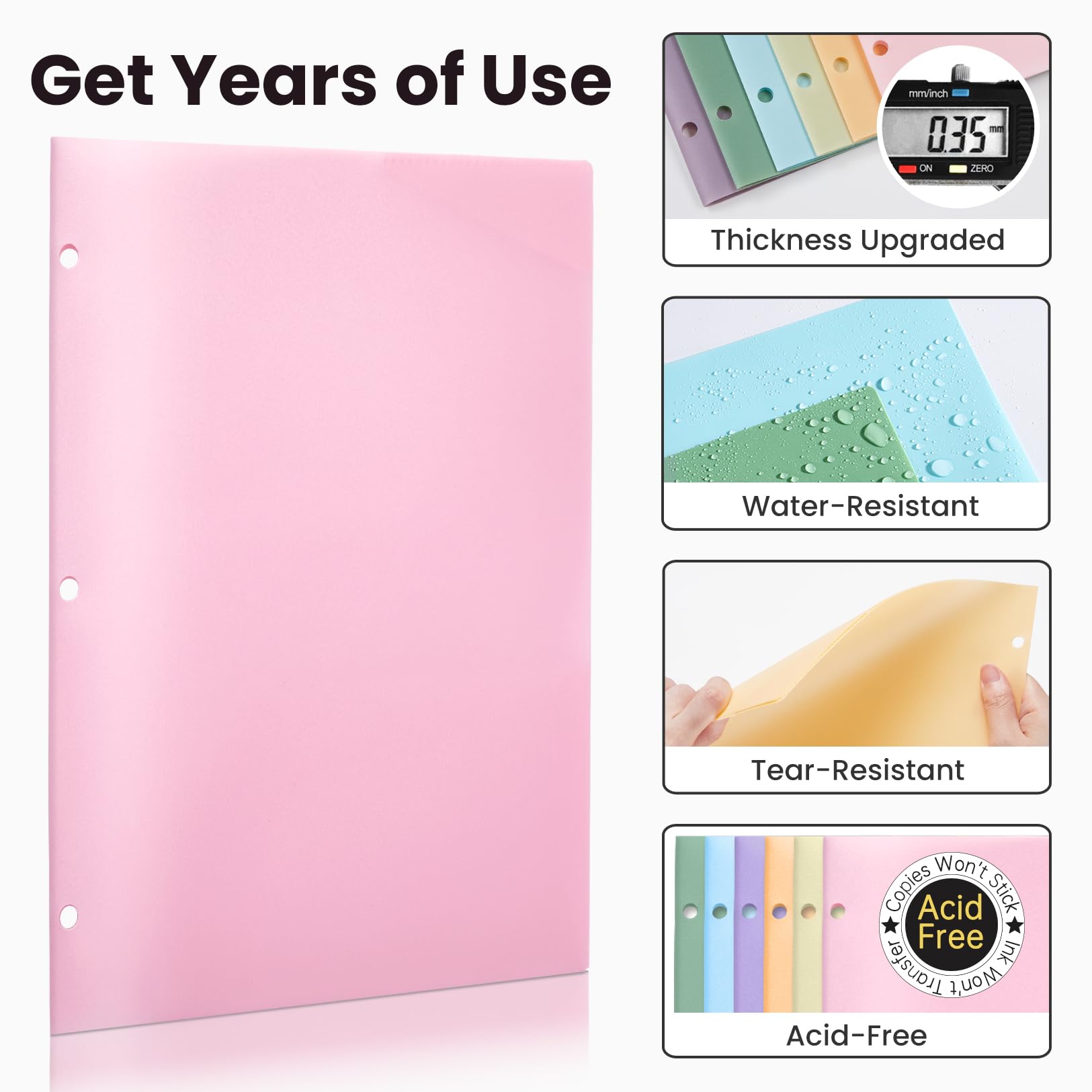 Stable & sturdy Material: Our folder is 0.35 mm thick. The thickness of our plastic folders exceeds that of our rivals', even twice thick. Made of durable and cleanable poly material, water-resistant, tear-resistant and acid-free folders can last for many years.