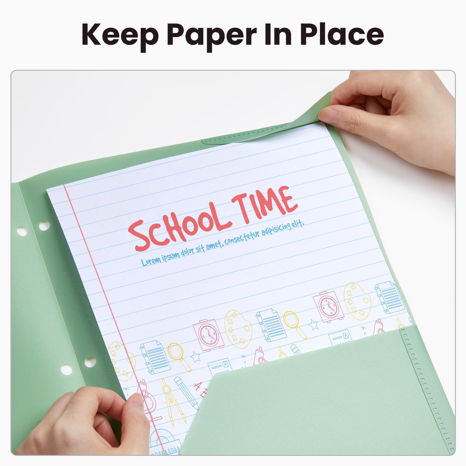 2 Secure Paper Tabs: The Excellent Design of 2 tabs for preventing the paper from falling out. Two pocket folders feature 3-hole punched and two inner pockets with one die-cut business card slot in left pocket.