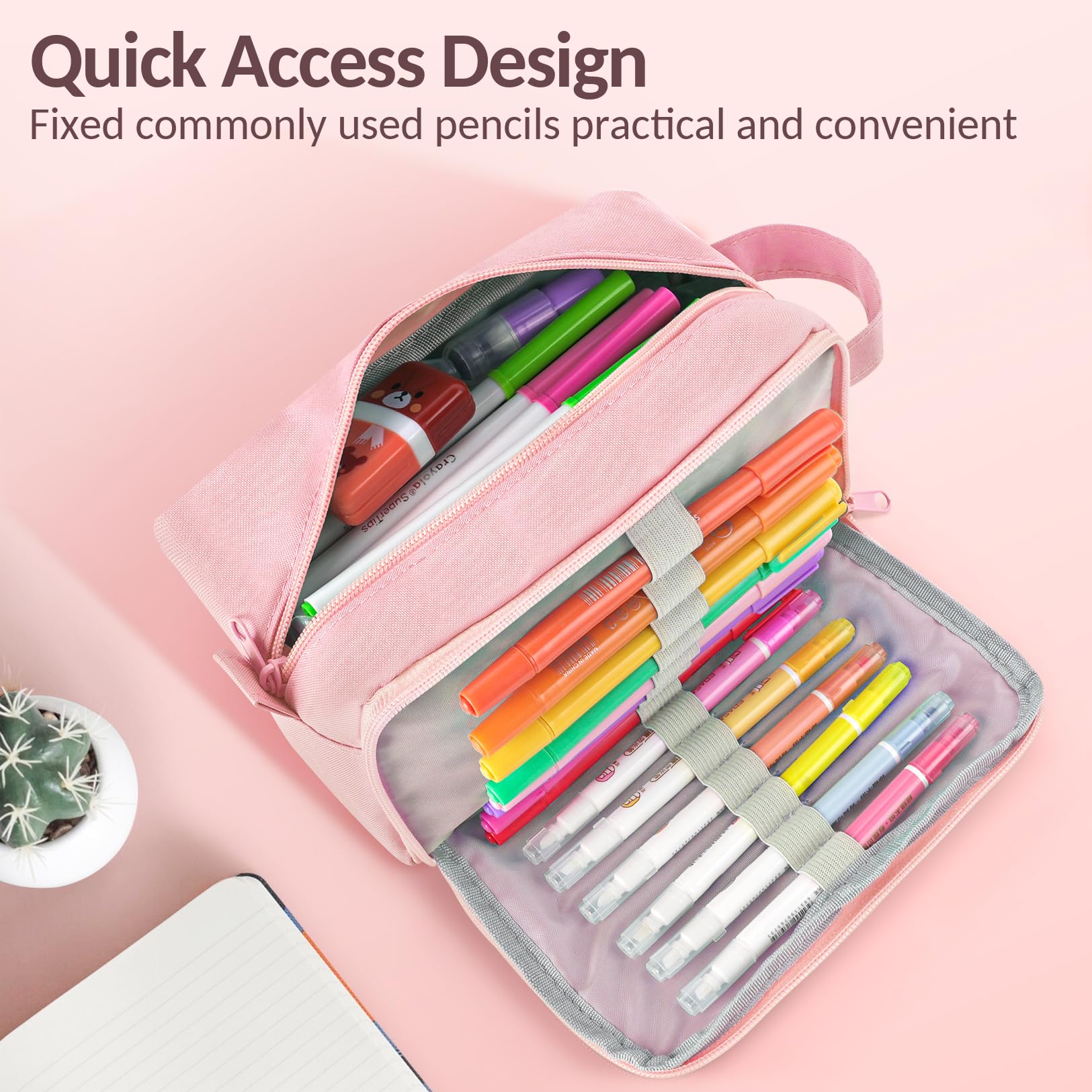 Quick Access Design: Roomy space with 3 Compartments to separate and organize your different stationery. 14 elastic straps, convenient to hold all your frequently used pencils. A spacious main compartment could be open widely, allowing you to quickly see everything inside. Easy to use, easy to find items