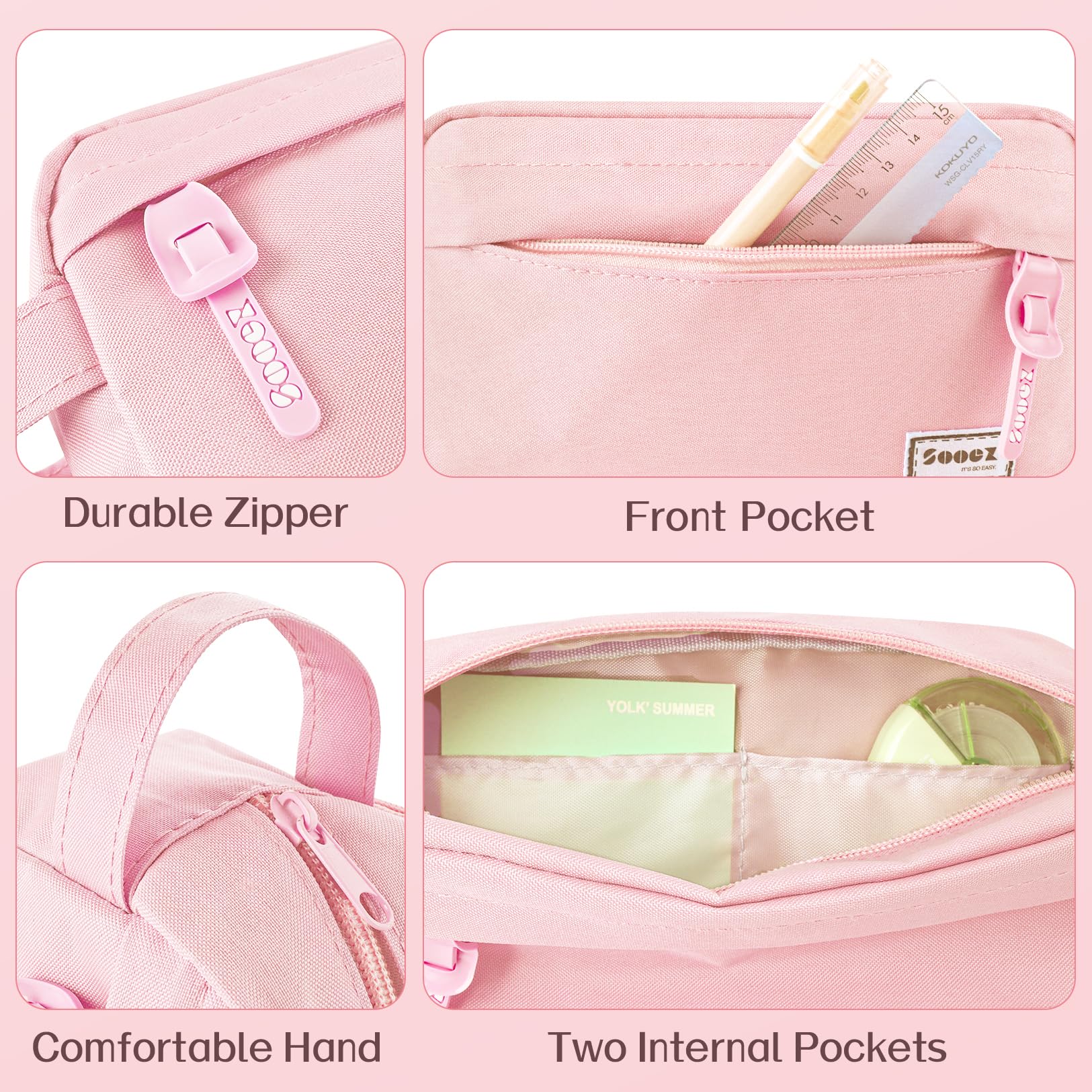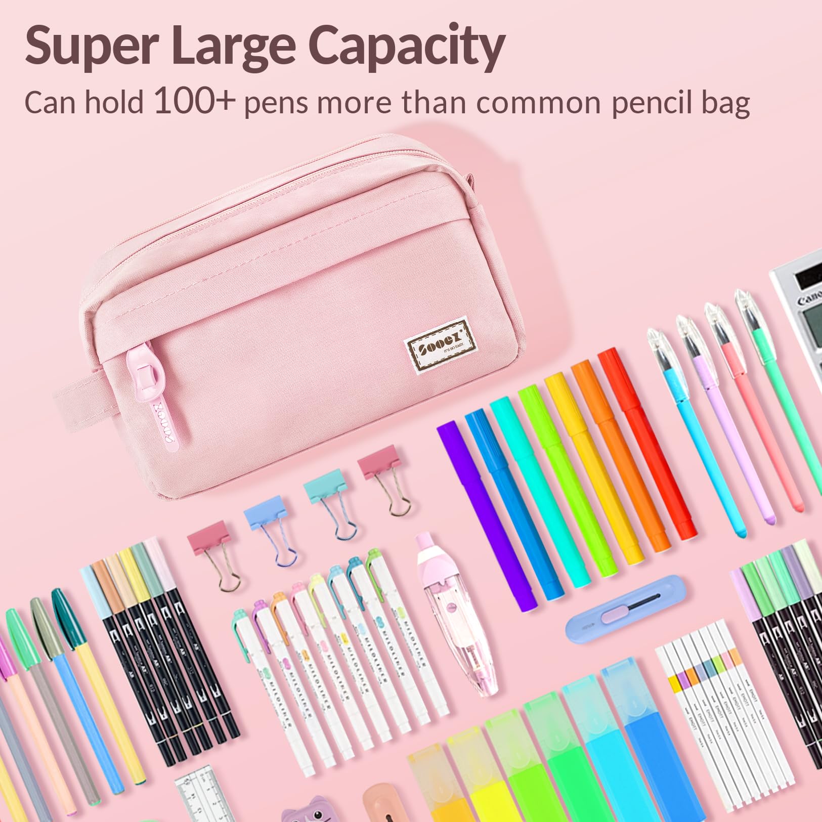 Super Large Storage: This pencil case is probably the biggest one you've ever come across. Huge storage space that can hold up to 100 pens or pencils. Perfect for students who carry a variety of tools besides pens, such as pens,such as markers, rubber, calculator and more