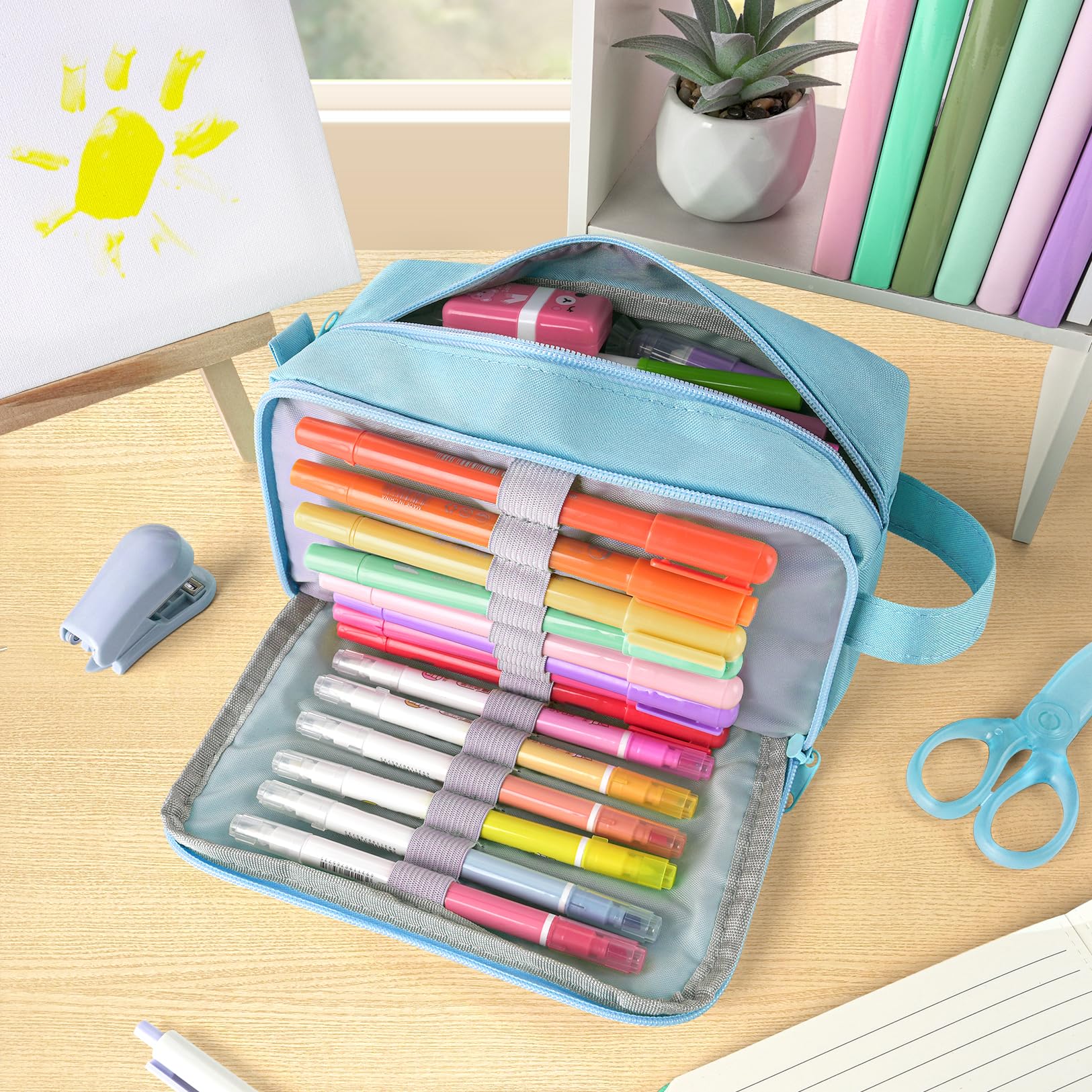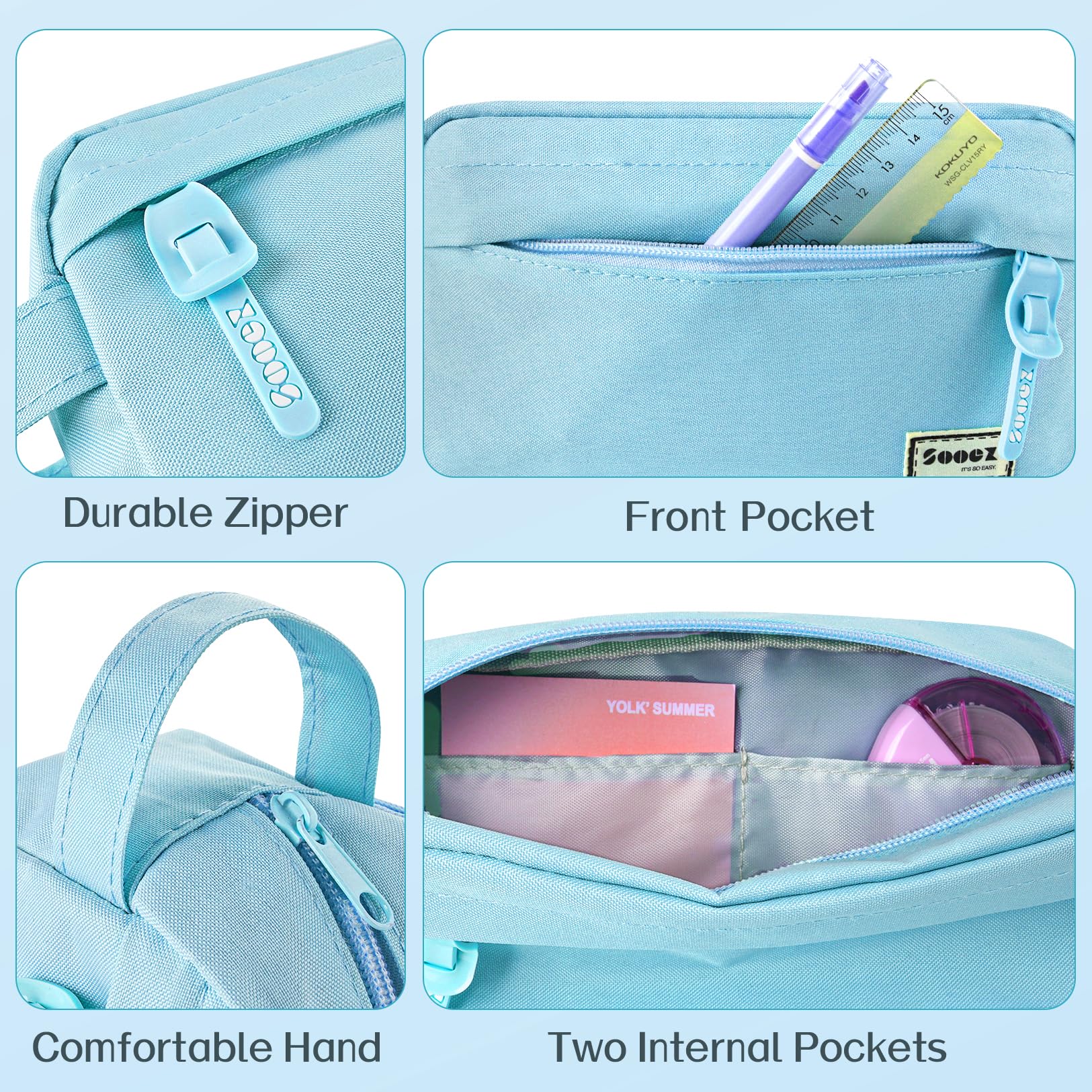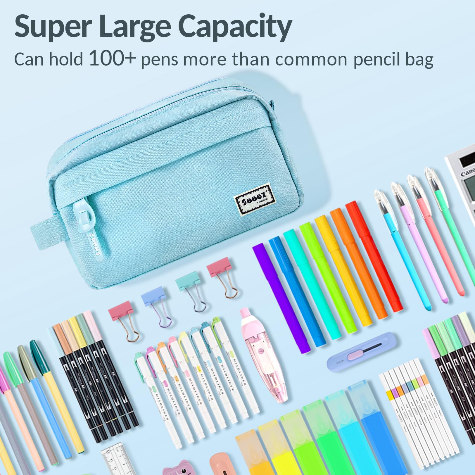 Super Large Storage: This pencil case is probably the biggest one you've ever come across. Huge storage space that can hold up to 100 pens or pencils. Perfect for students who carry a variety of tools besides pens, such as pens,such as markers, rubber, calculator and more
