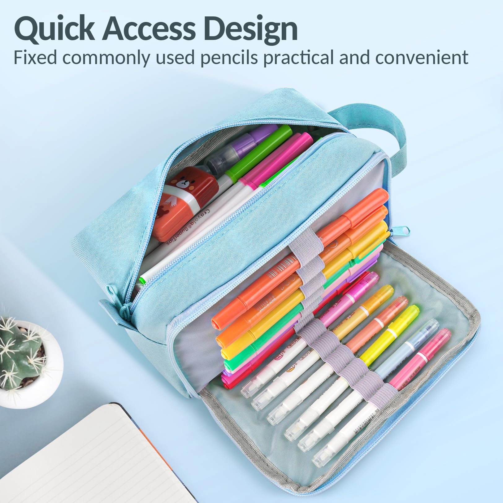 Quick Access Design: Roomy space with 3 Compartments to separate and organize your different stationery. 14 elastic straps, convenient to hold all your frequently used pencils. A spacious main compartment could be open widely, allowing you to quickly see everything inside. Easy to use, easy to find items