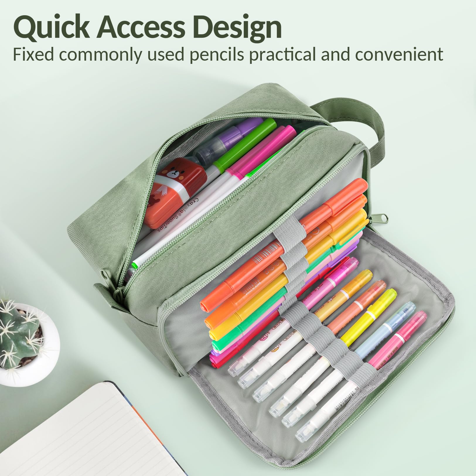 Quick Access Design: Roomy space with 3 Compartments to separate and organize your different stationery. 14 elastic straps, convenient to hold all your frequently used pencils. A spacious main compartment could be open widely, allowing you to quickly see everything inside. Easy to use, easy to find items