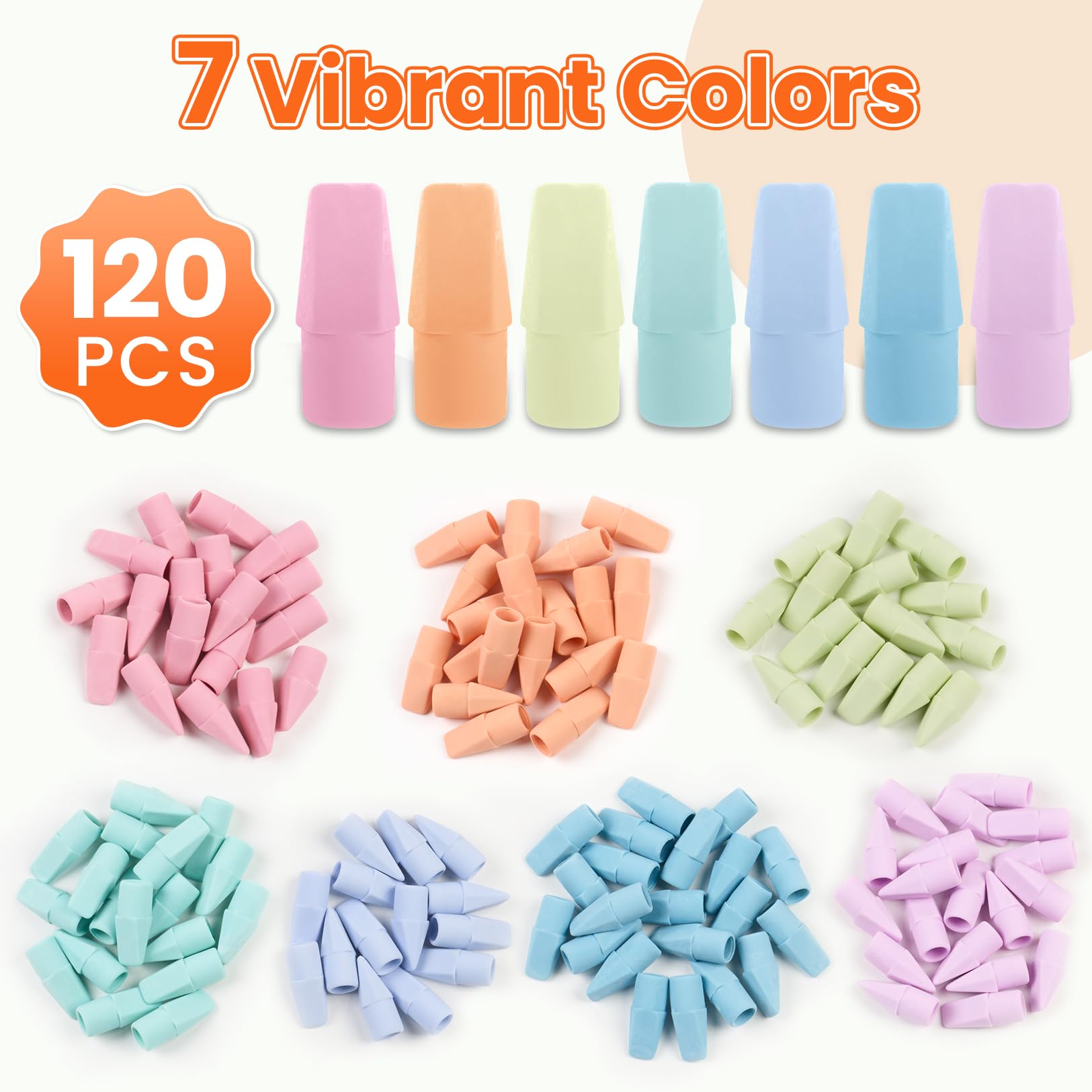 What You Get: A set of 120 in 7 vibrant colors, making it a perfect addition to your office or school supplies. The generous quantity ensures you have plenty for all your decoration and replacement needs. These pencil top erasers come packaged in a clear storage box, ensuring safety and convenience during transportation