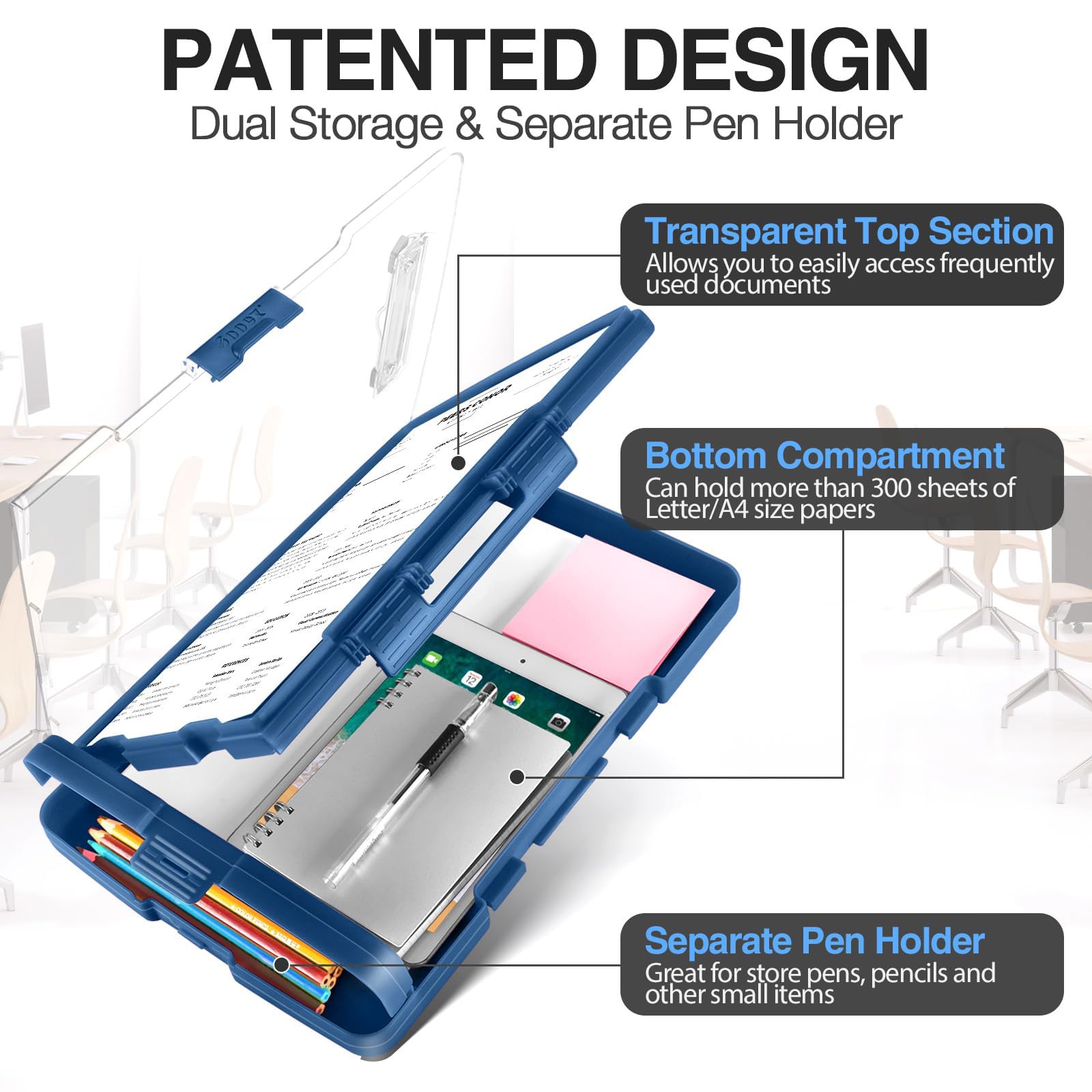 [Patented Design] Dual Storage & Separate Pen Holder: Pattened dual-Layer design along with the pen/pencil case ensure roomy space for various needs of storage. Keep frequently used documents on the top compartment and store more than 300 sheets in the spacious bottom compartment. Separate pen/pencil case for pens, pencils, markers, clips and other small items.