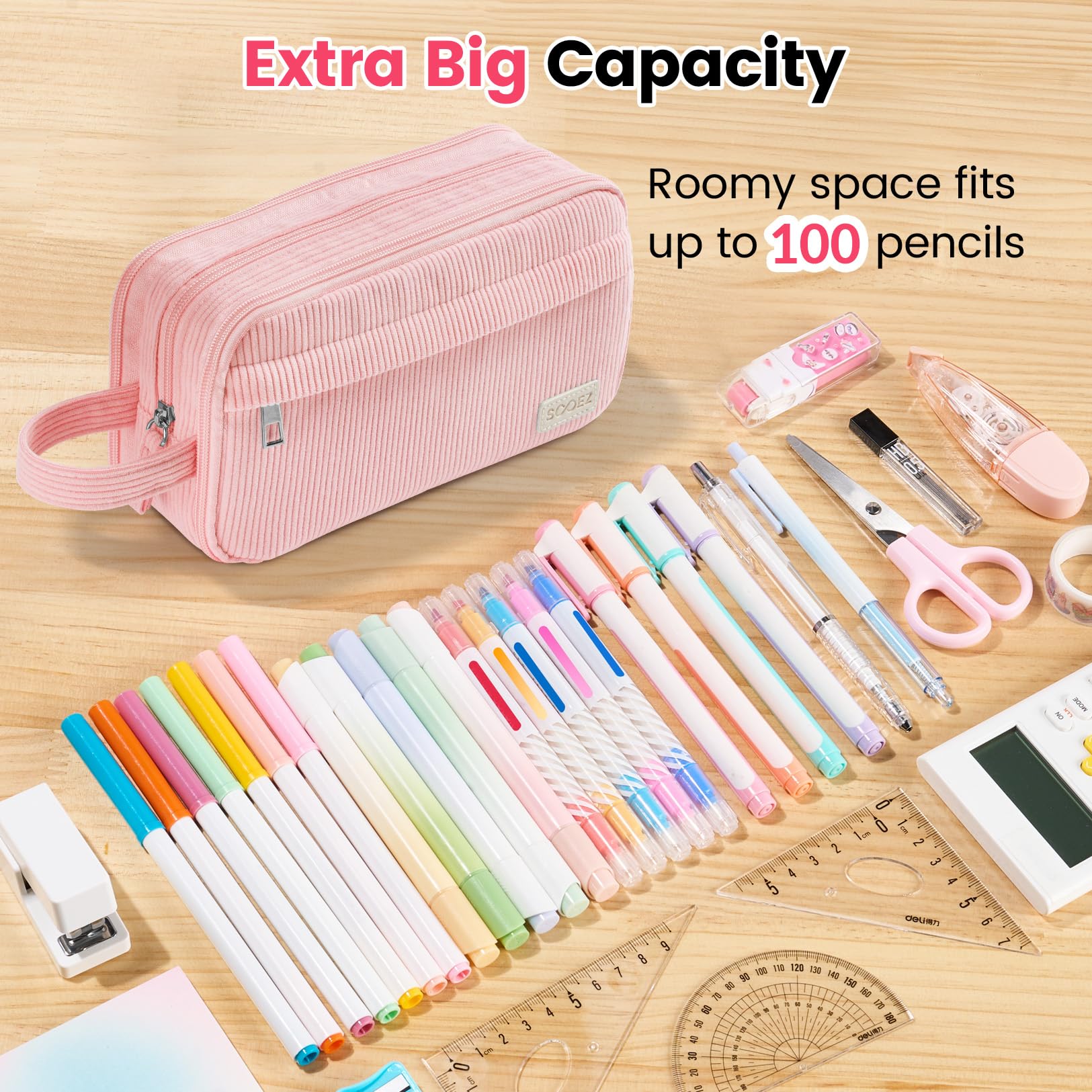 Extra Big Capacity: Sooez pencil case new upgraded size 8.6 x 4.3 x 3 inches. Large capacity storage can store up to 100 pens or pencils. Perfect for students who carry a variety of tools besides pens, such as pens,such as markers, rubber, calculator and more. Age of Application: 3 yrs+