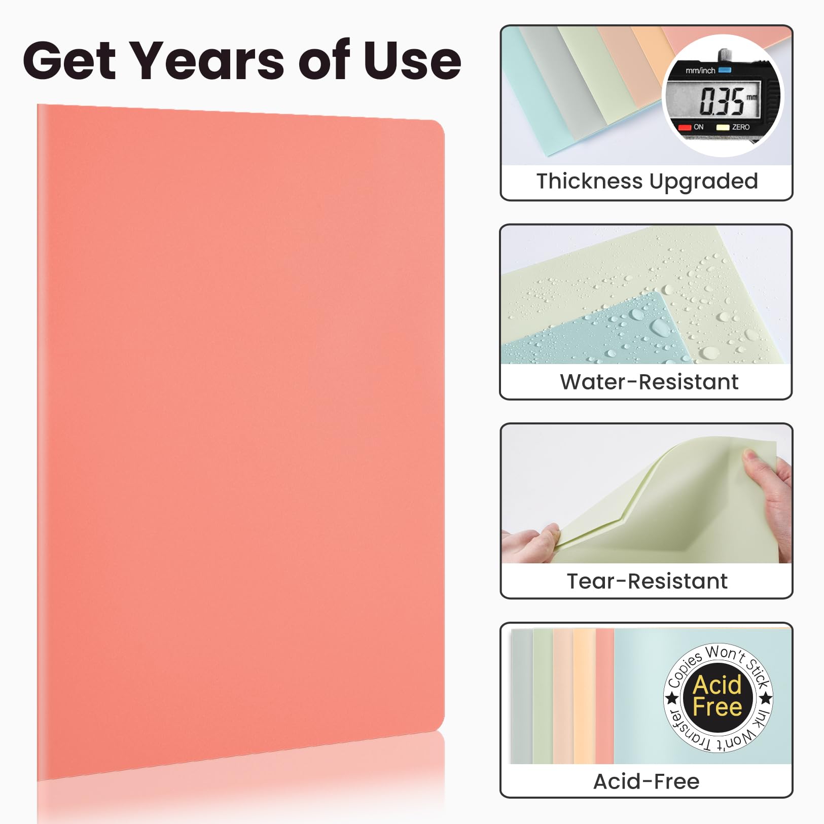 Stable & sturdy Material: Our folder is 0.35 mm thick. The thickness of our plastic folders exceeds that of our rivals', even twice thick. Made of durable and cleanable poly material, water-resistant, tear-resistant and acid-free folders can last for many years