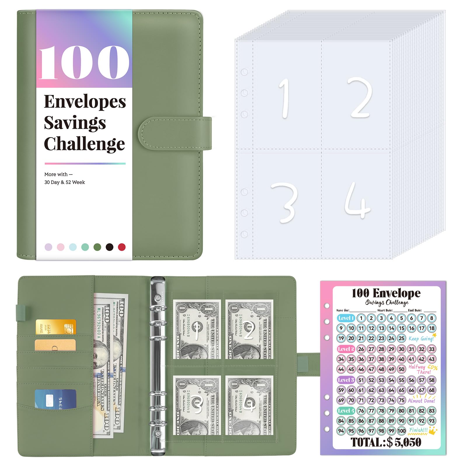 Money Savings Binder Kit: A5 PU leather binder, 1pcs double-sided & laminated tracker, and 100 envelopes slots pre-numbered with 1 to 100. Sooez 100 envelopes money saving challenge helps you build up an emergency savings fund and cultivates a saving habit.