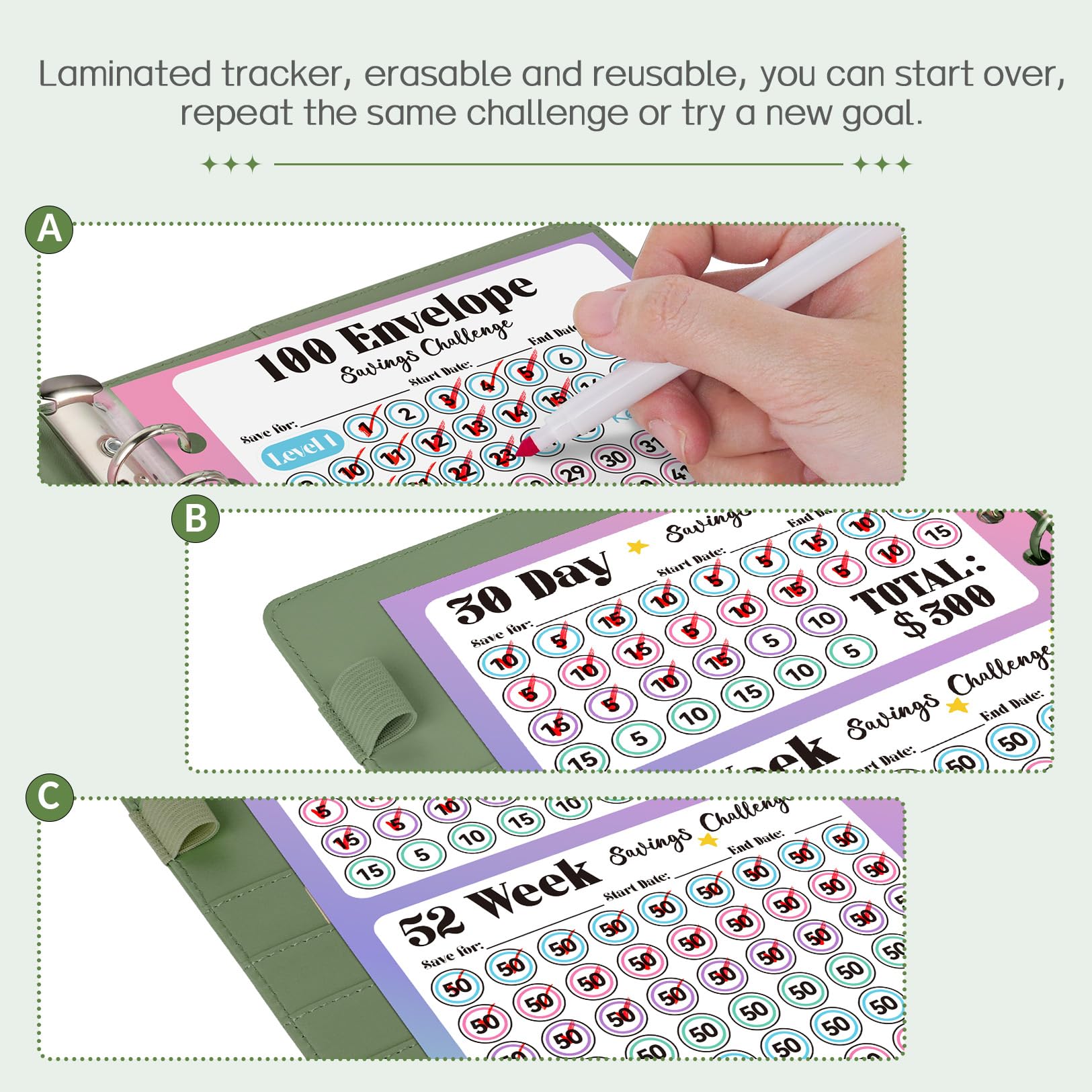 Reusable Laminated Tracker: Stay on top of savings progress easily with the handy tracker. 3 challenge options to choose from, 100 envelopes, 30 days, and 52 weeks challenges to fit your different needs for short or long-term goals like holiday, emergency, etc. Laminated tracker, resist tears and erasable, you can repeat the same challenge or try a new one.