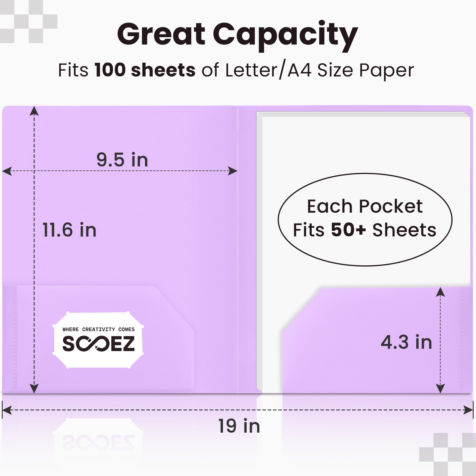 Dimension & Capacity:Each 9.45"L x 11.65"W plastic 2 pocket folders come with two 5" high pockets that each can safely hold up more than 50 letter-sized documents, sales sheets, brochures and more