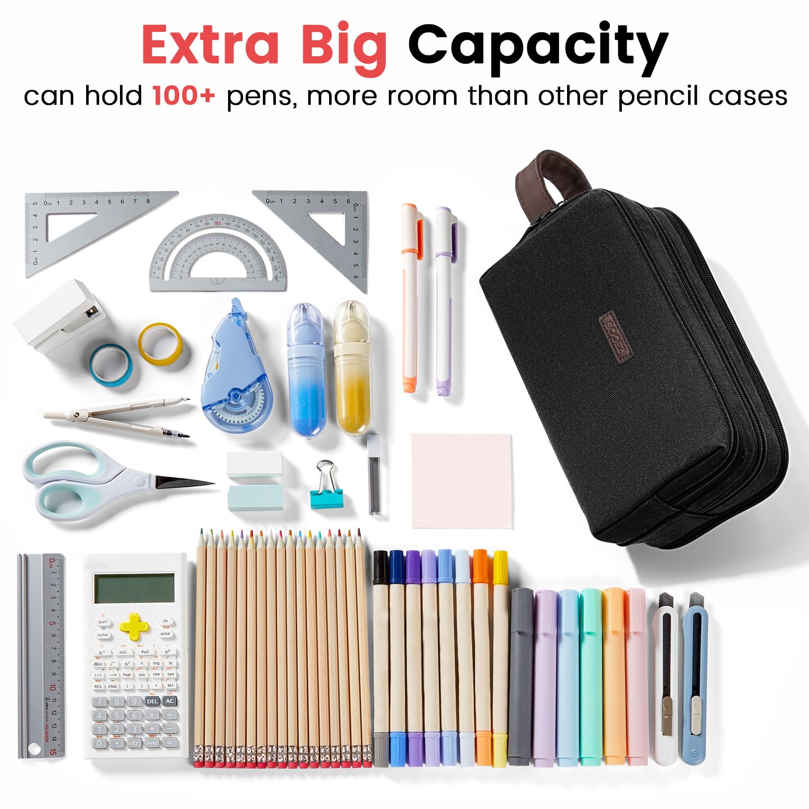 Extra big Capacity: This smart large pencil case has upgraded size of 9.25*5.15*3.25 inch, it can hold 100+ pens & other supplies, keep all your school and office supplies in place, like pen, pencil, marker, eraser, calculator, tape.