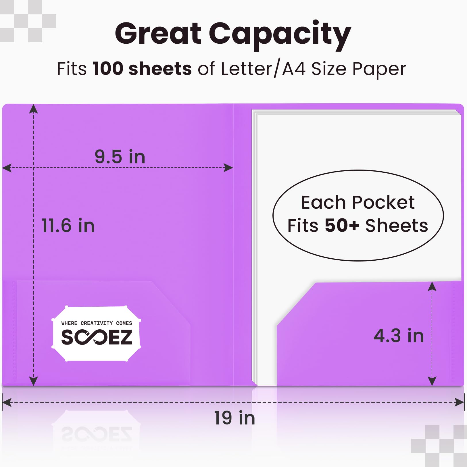 Dimension & Capacity:Each 9.45"L x 11.65"W plastic 2 pocket folders come with two 5" high pockets that each can safely hold up more than 50 letter-sized documents, sales sheets, brochures and more.