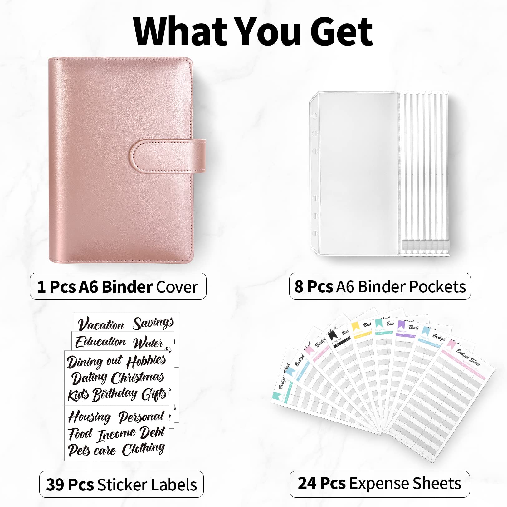 72pcs Value pack - Cash wallet envelope system: A6 PU leather money saving binder, 6 sheets/39 category large sticker labels, 24pcs expense budget sheets, 8pcs binder pockets. Meet your all various needs in daily record, budget and storage. Perfect for all ages to save money.