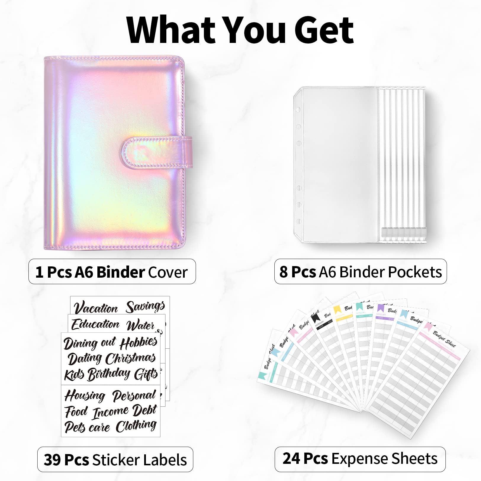 Pretty Budget Binder for Organizing: Shiny A6 cover, 39 category sticker labels, 24pcs budget sheets and 8pcs cash envelopes. Fancy and compact, a good helper to meets your daily budget needs. Keep documents and develop healthy money habits.