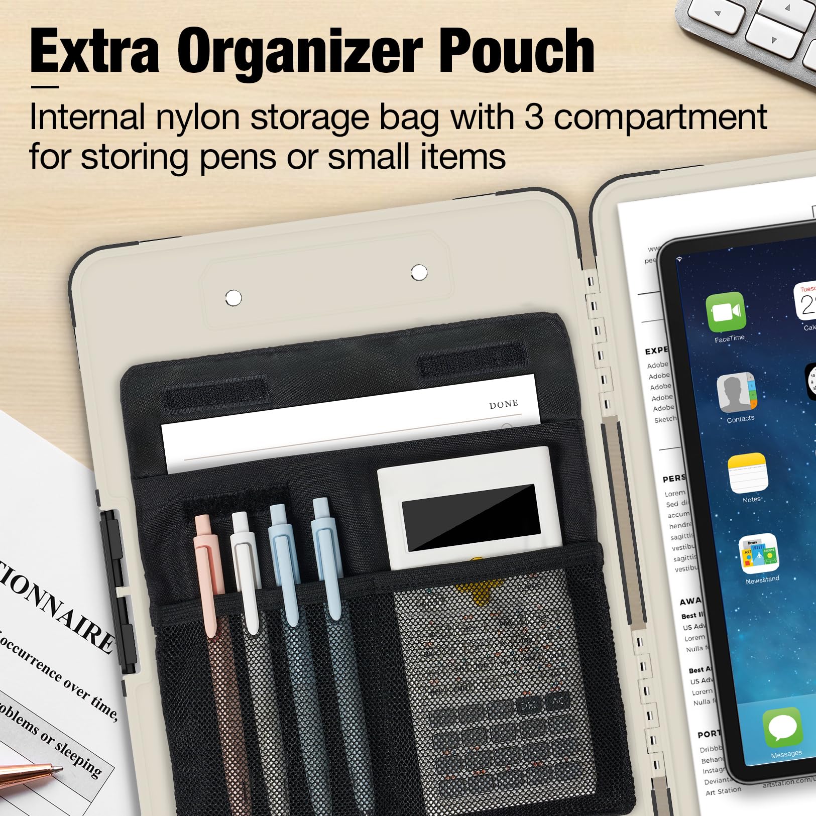 Internal Pen Pouch Organizer: Our storage clipboard features an extra nylon pouch inside, equipped with three compartments – two mesh pockets for smaller items and one larger pocket for bulkier essentials. Provide a place for your pens, calculator, sticky notes, ruler, or business cards