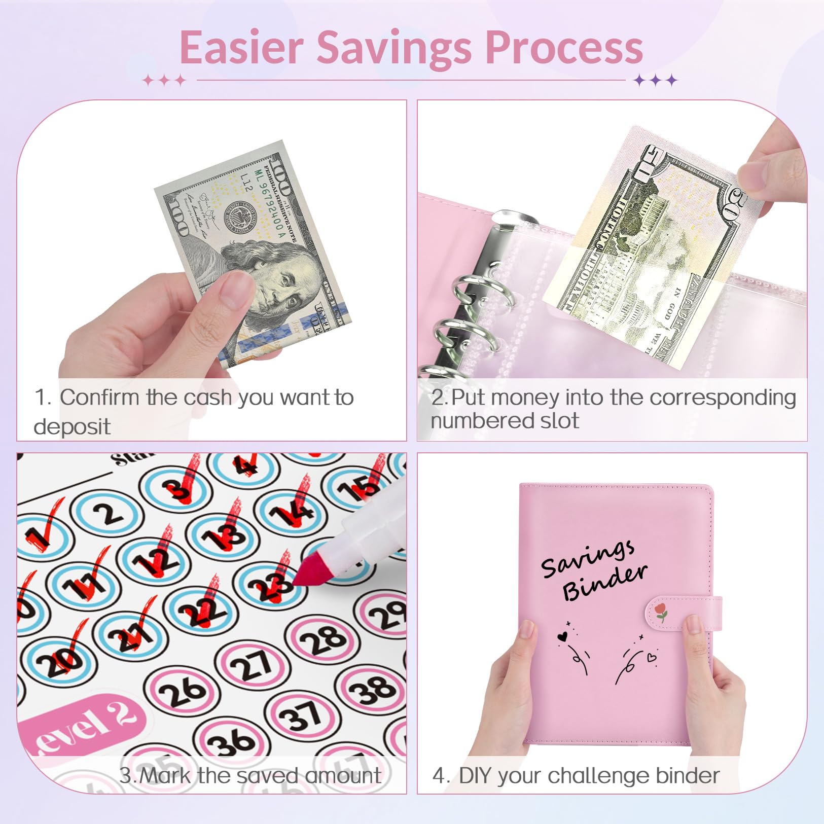 2 Pack Money Savings Binder Kit: Each pack of one A5 PU leather binder, 1pcs double-sided & laminated tracker, and 100 envelopes slots pre-numbered with 1 to 100. Sooez 100 envelopes money saving challenge helps you build up an emergency savings fund and cultivates a saving habit.