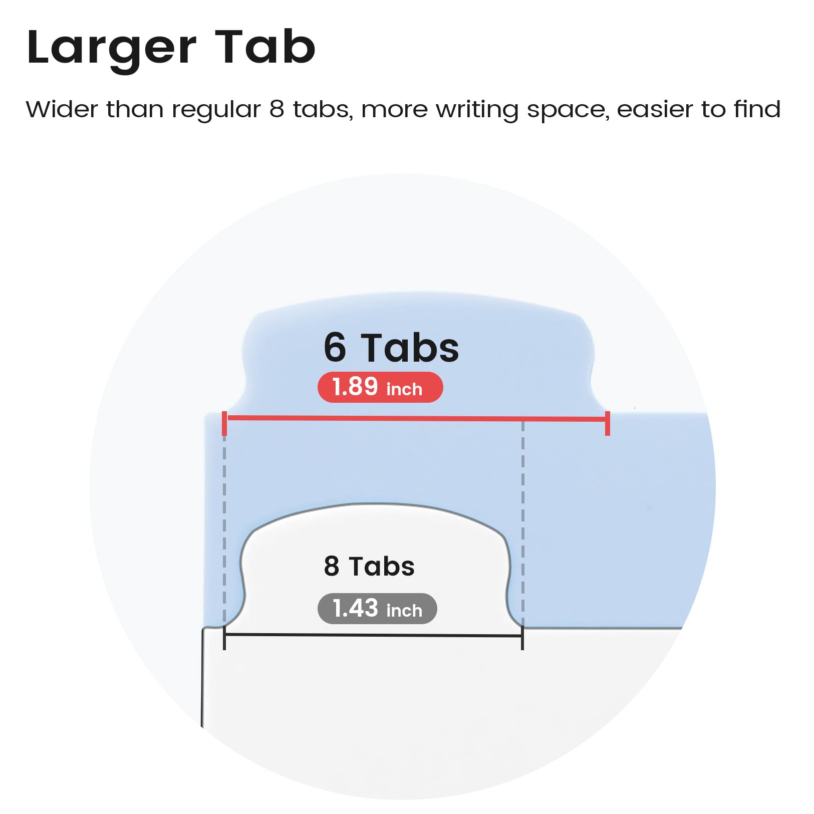 6 Tabs: Each divider features 6 large tabs, perfectly sized for 8.5" × 11" paper and designed to fit a standard 3-ring binder. The tabs are clearly visible for easy organization and quick reference.