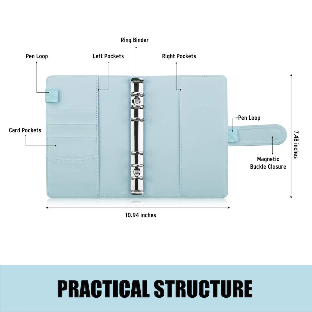 Practical Structure: Sooez notebook binder is structured with a convenient magnetic buckle closure, 4 card slots and 2 pockets for passport/ tickets/notes etc, 1 stainless steel 6-ring (0.79 in diameter) binder and 2 pen elastic loops keep your pens at your fingertip, recording your life anywhere, anytime.
