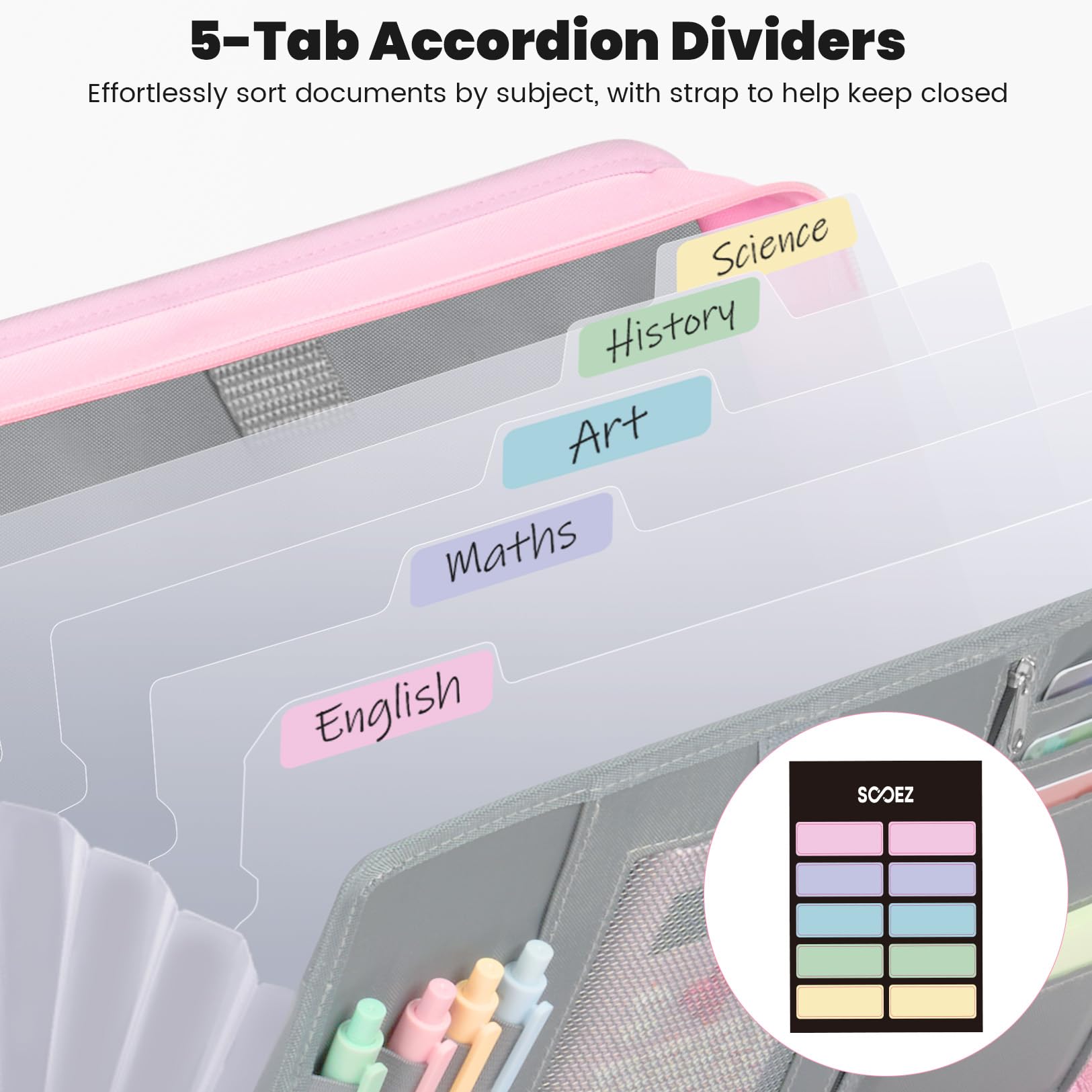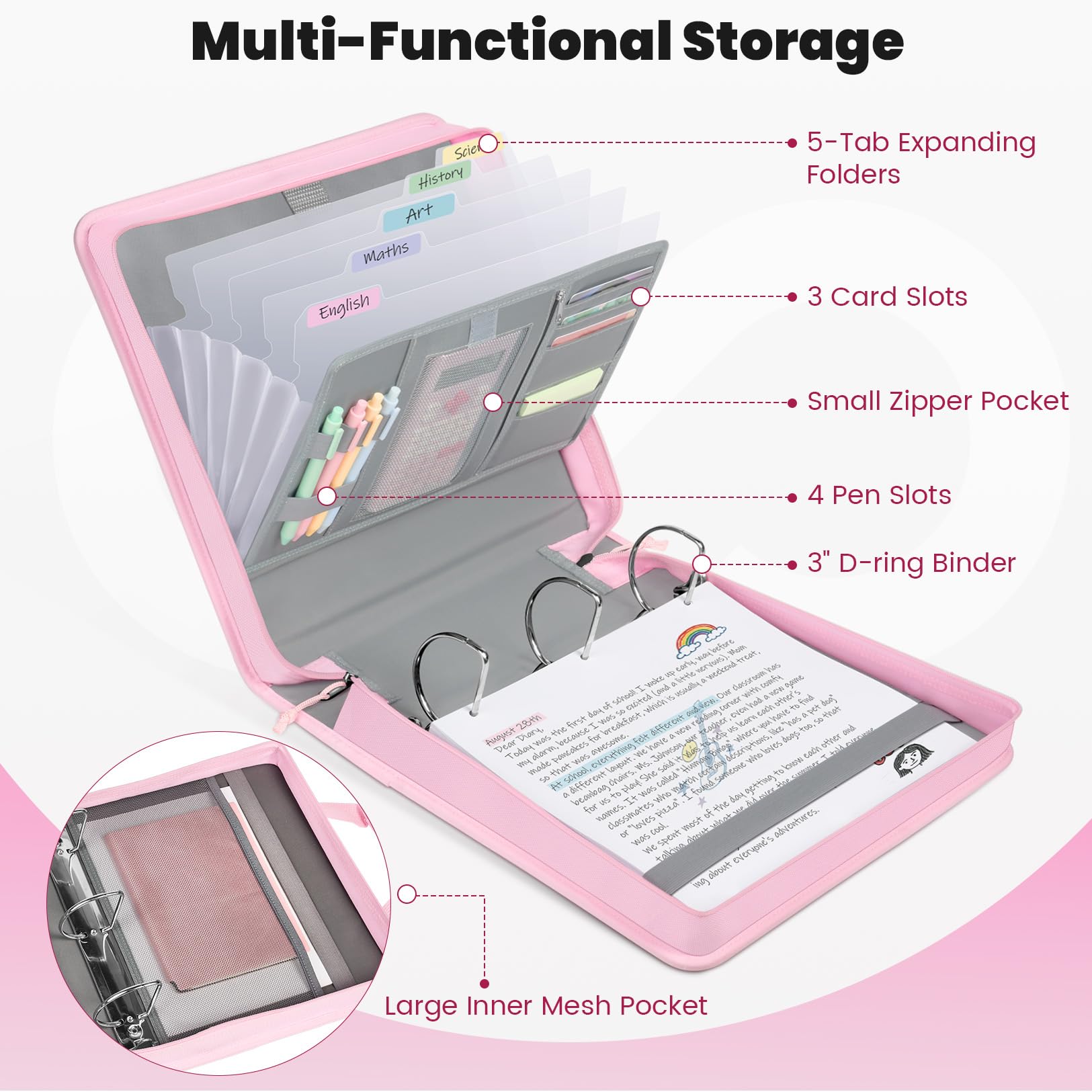 Multi-Storage Design: Features a front zipper pocket for quick access and interior multi-pockets for cards and small items. Plus 5-tab accordion folders to keep papers neatly sorted by subject. The sturdy 3-ring binder securely holds hole-punched sheets or dividers with an elastic strap to keep loose papers in place. There's also a larger mesh pocket for added storage flexibility