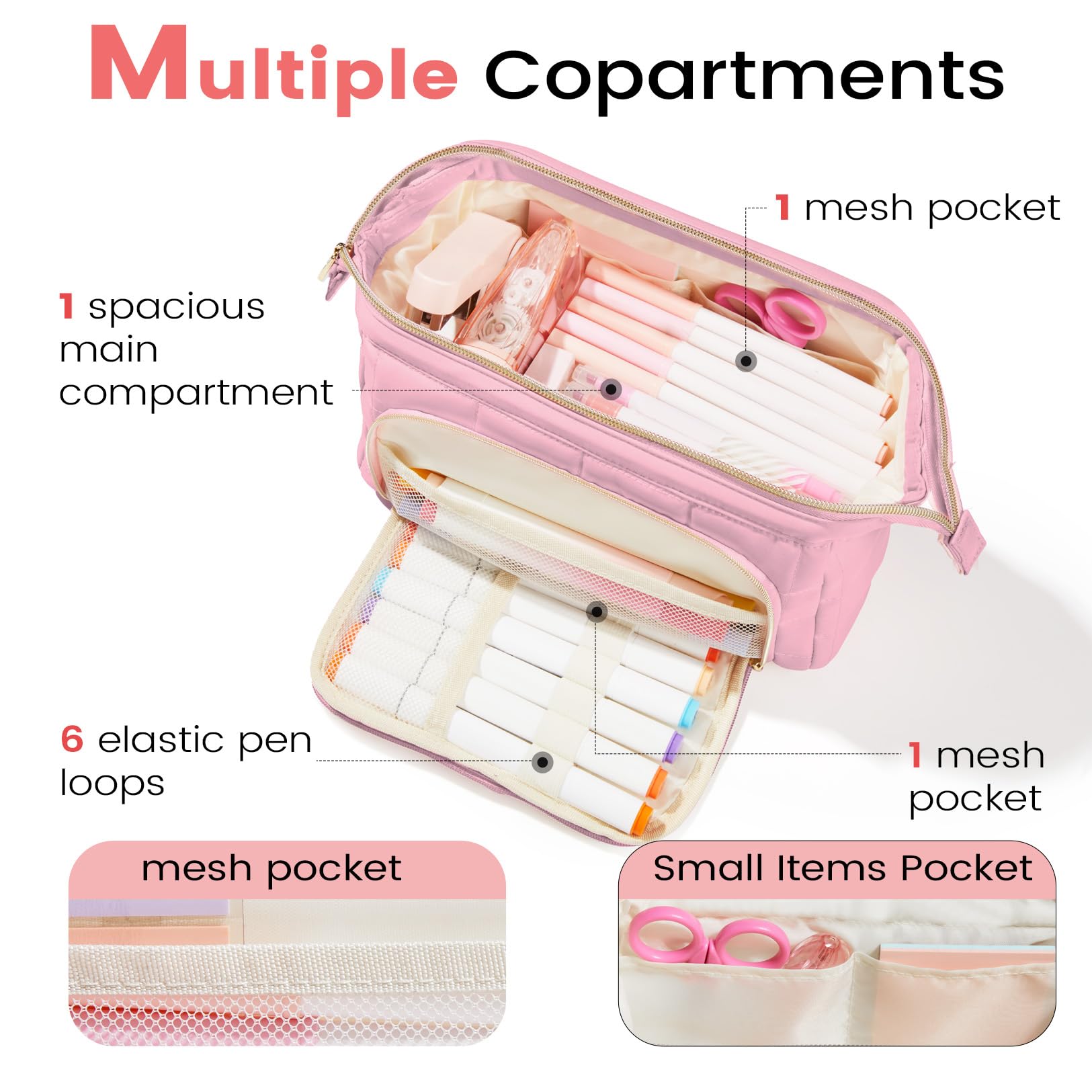 Multiple Compartments for Easy Storage: A spacious main compartment, the front zip pocket contains 5x elastic pen loops, 1x mesh pocket. Our large pencil case provides enough space for your school supplies, makeup, sewing supplies or 3C supplies.