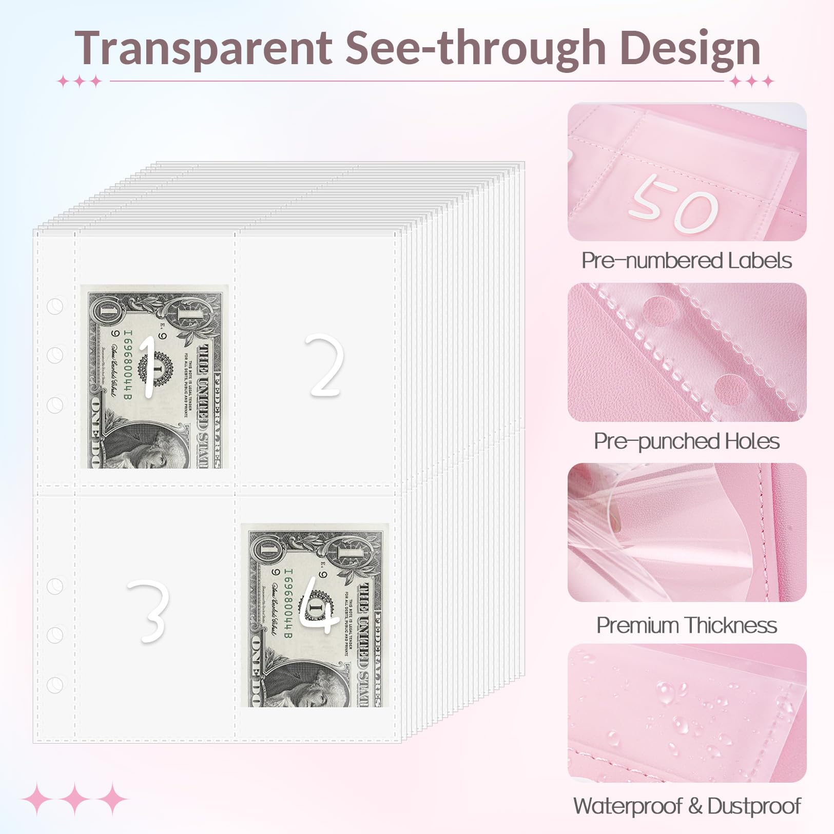 Superior Material: Thickened PU Leather savings binder is scratch-resistant and sturdy. 100 transparent PVC cash envelope slots, pre-printed clearly with 1 to 100, waterproof and tear proof, keep and secure your money