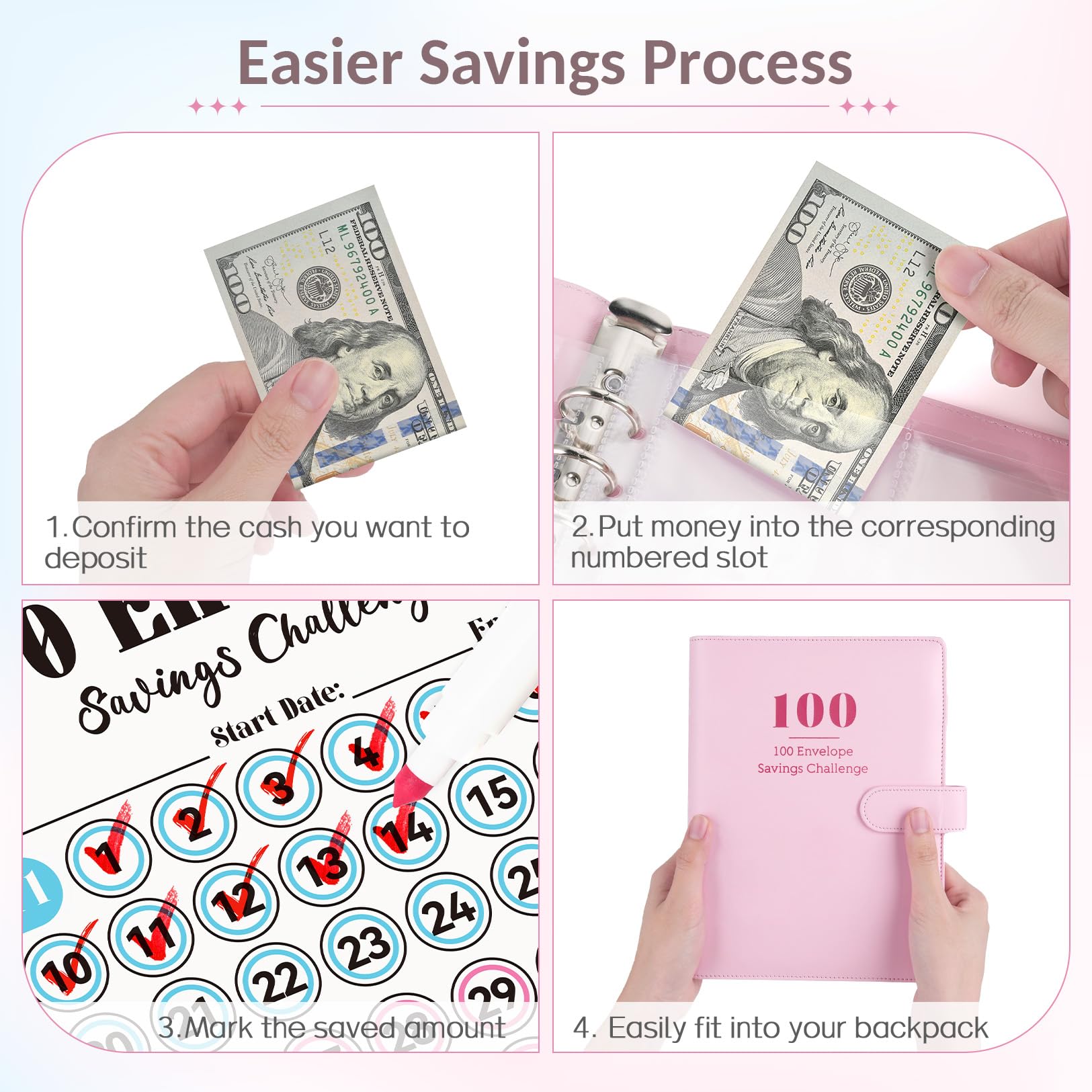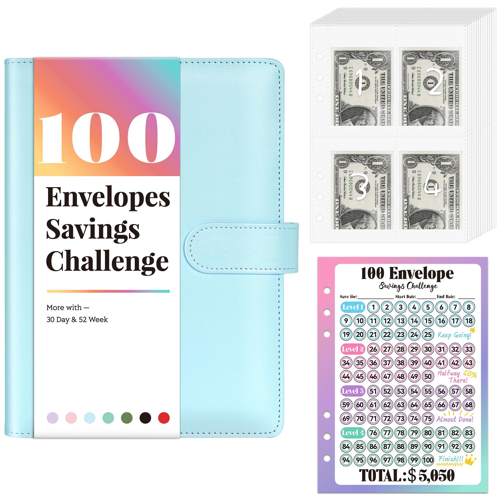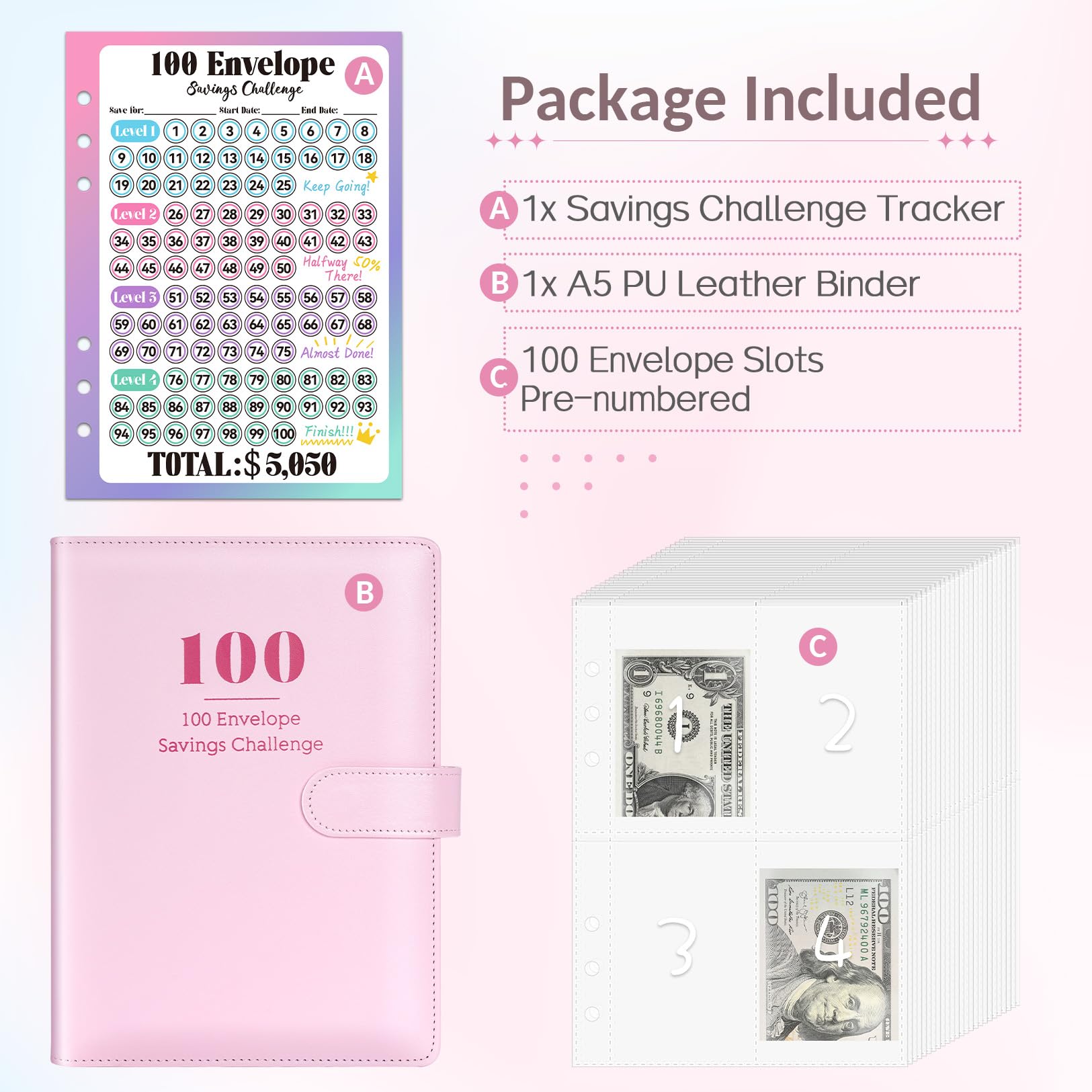Money Savings Challenge Kit: 1 A5 PU leather binder, savings tracker for marking, and 25 transparent cash envelopes pre-numbered with 1 to 100. Sooez money saving binder helps you build up an emergency savings fund and cultivates a saving habit throughout the save money challenge.