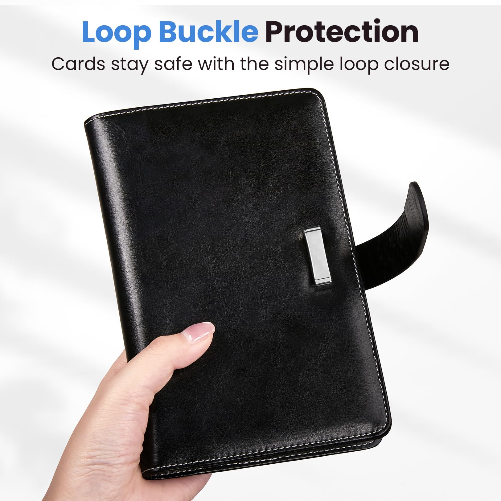 Secure Loop Buckle Closure: The sturdy loop buckle ensures your cards are held firmly in place, offering reliable protection against loss and damage. Perfectly organizes business cards, credit cards, gift cards, debit cards—all in one sleek holder.