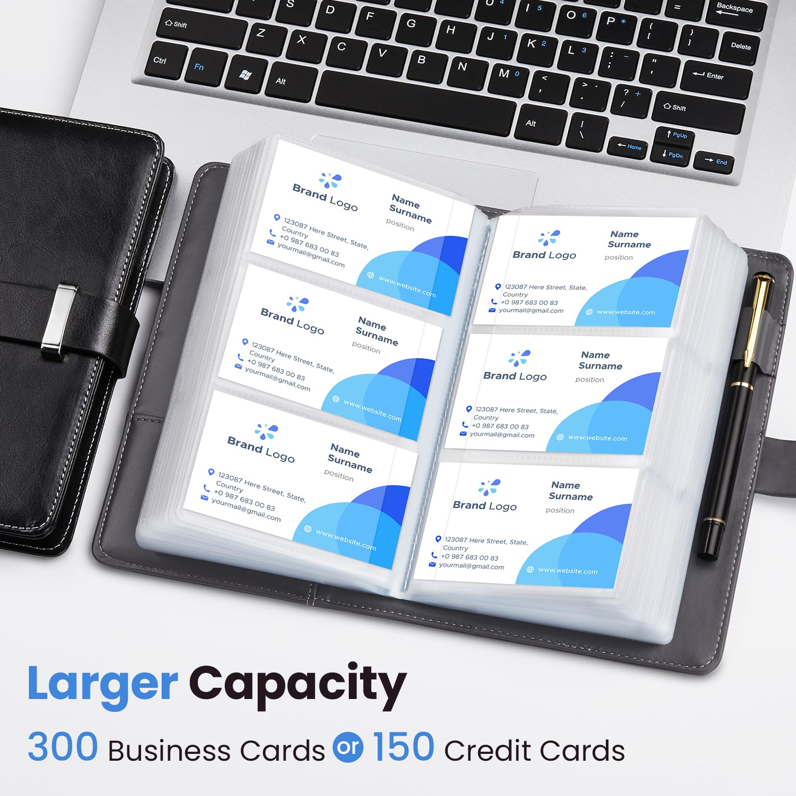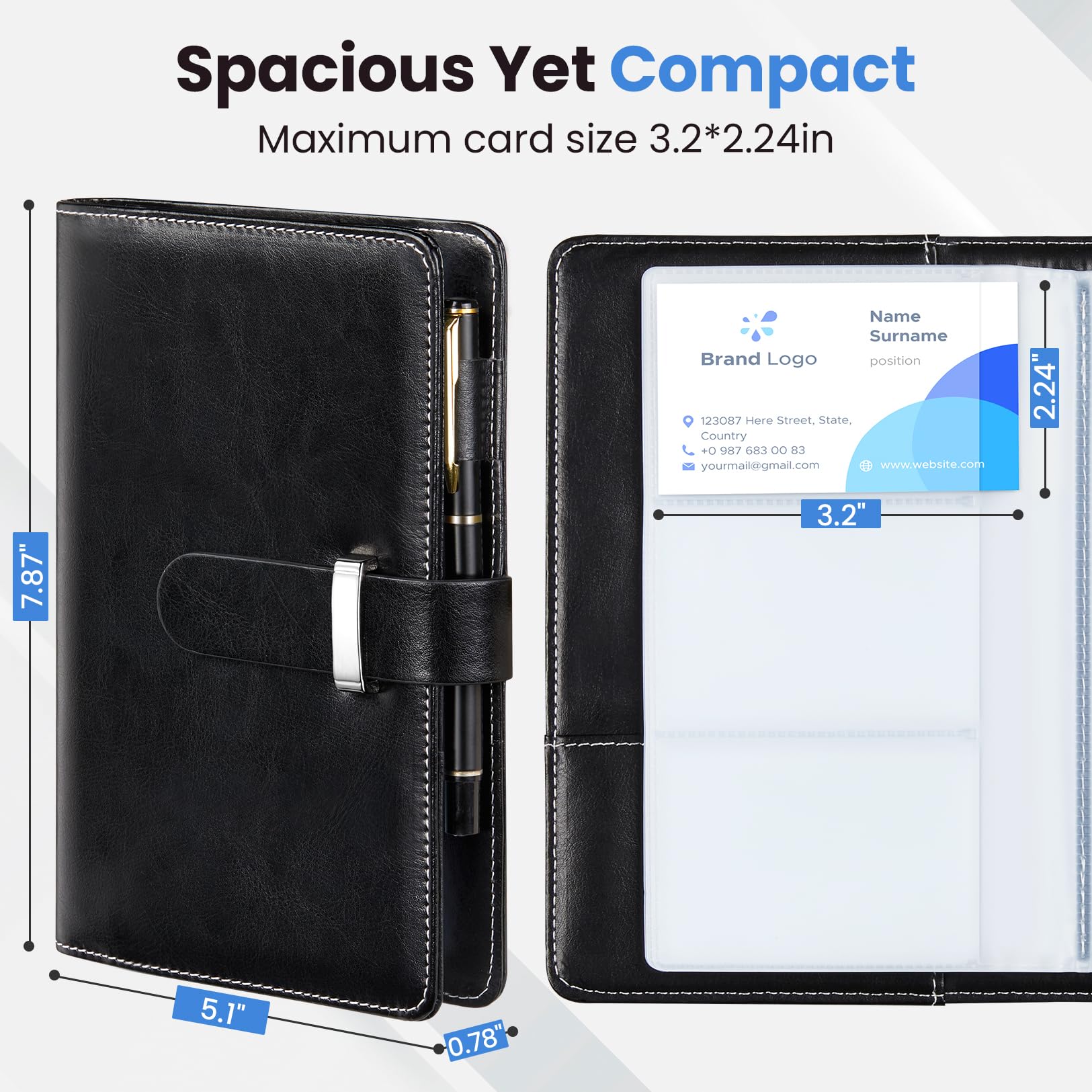 Large 300-Card Capacity: Holds 300 business cards back-to-back or 150 credit cards. Accommodate standard 3"×2.16" cards with perfect fit. Features 2 interior pockets for cash, notes, IDs, and so on. A built-in pen loop keeps your go-to pen always at hand.