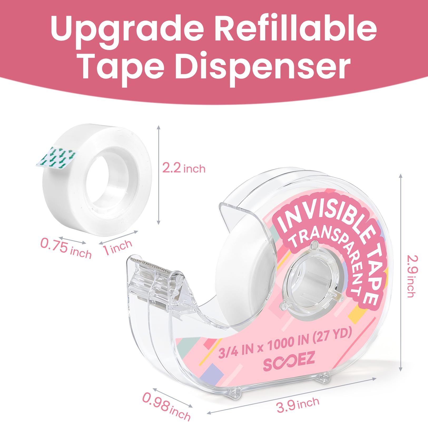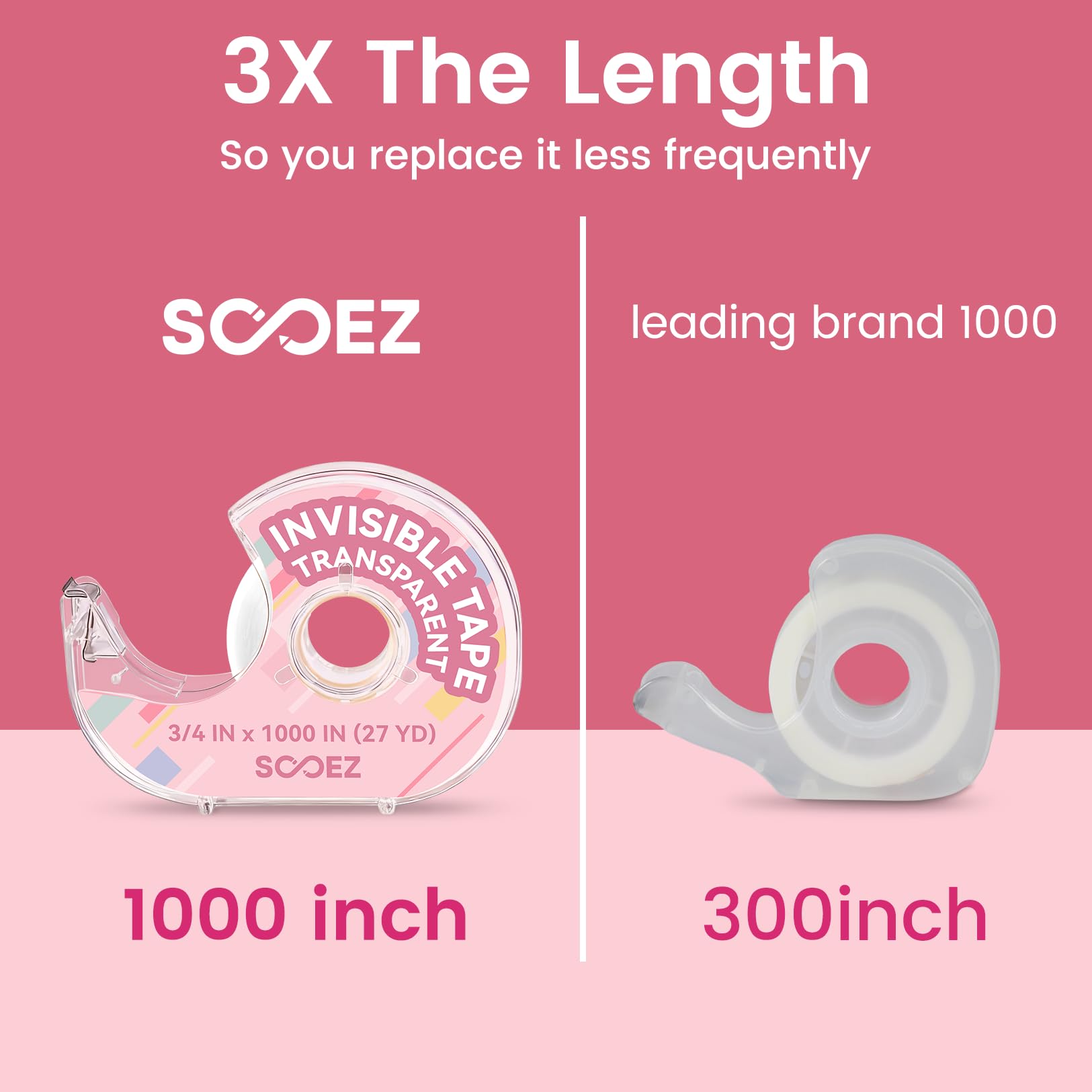 1000 Inch & 3 Mega Rolls : Sooez transparent tape for gift wrapping. Enjoy sooez wrapping tape that is 3X Longer than the leading tape brand. Each tape roll is 3/4 x 1000 inches, and you get 3 dispensers in assorted colors. The huge capacity means less frequent repurchasing and a tape solution ready for every room and project