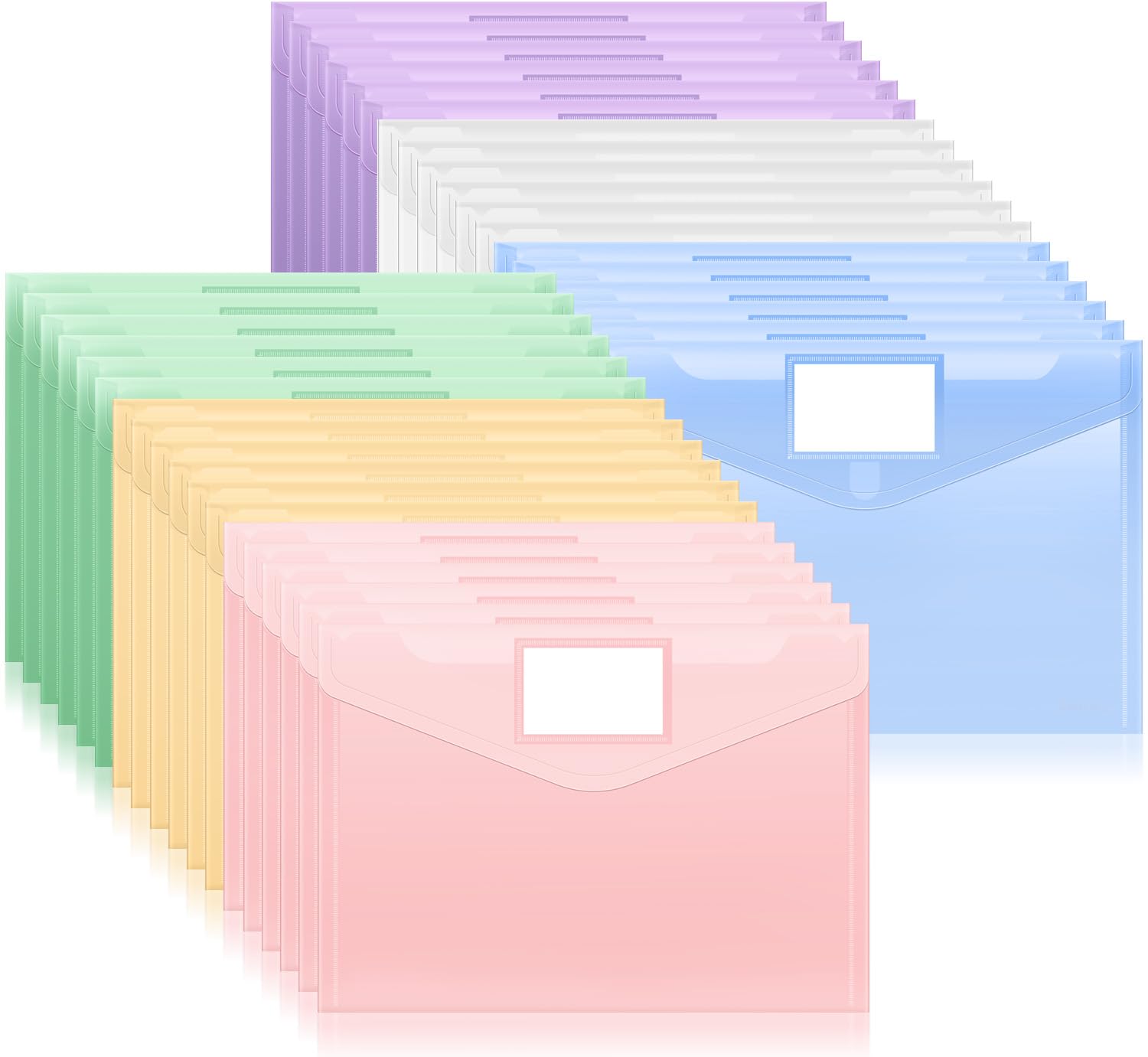 Sooez 40 Pack Plastic Envelopes, Plastic File Folders, Clear Folders for Documents Trendy Colors, Super Heavyweight Document Holders, Storage Pouches, File Envelopes for School Office Supplies