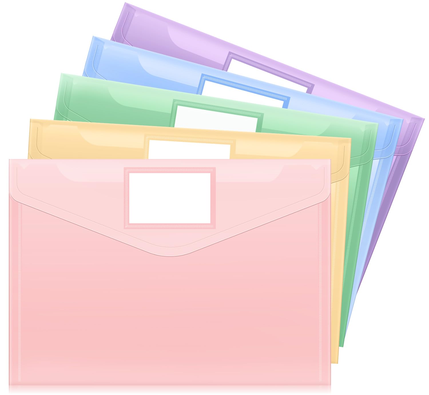 Sooez 5 Packs Plastic Envelopes Plastic File Folders, Clear Document Organizer Folder US Letter A4 Size Folders for Documents with Label Pocket for School Office Work Home Organization, Fresh Colors