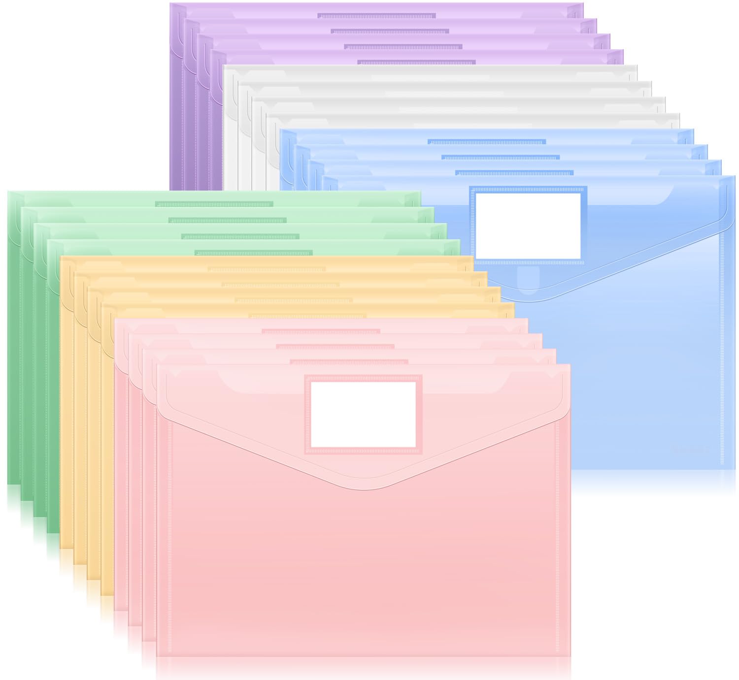 Sooez 24 Packs Plastic Envelopes Plastic File Folders, Clear Document Organizer Folder US Letter A4 Size Folders for Documents with Label Pocket for School Office Work Home Organization, Fresh Colors