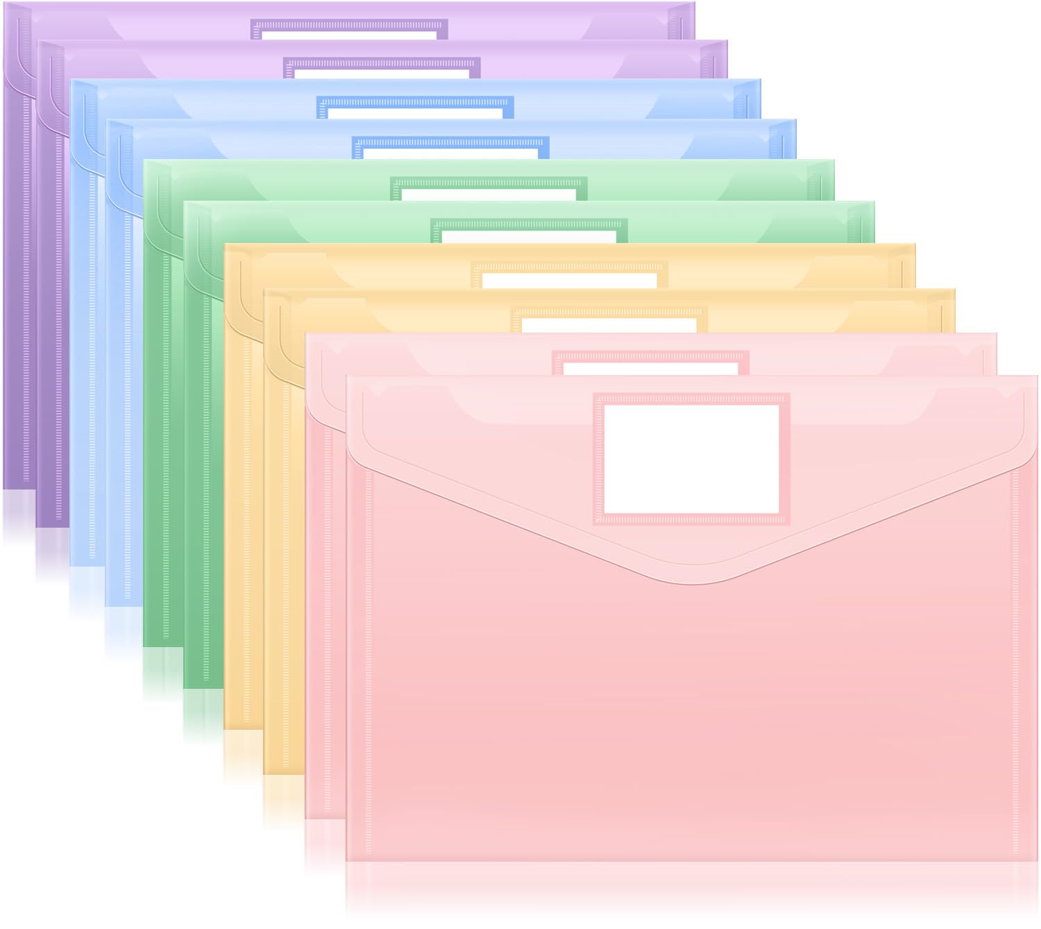 Sooez 10 Packs Plastic Envelopes Plastic File Folders, Clear Document Organizer Folder US Letter A4 Size Folders for Documents with Label Pocket for School Office Work Home Organization, Fresh Colors