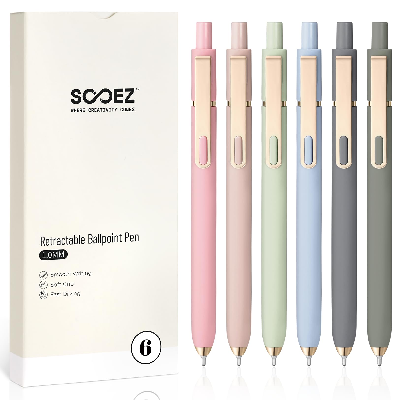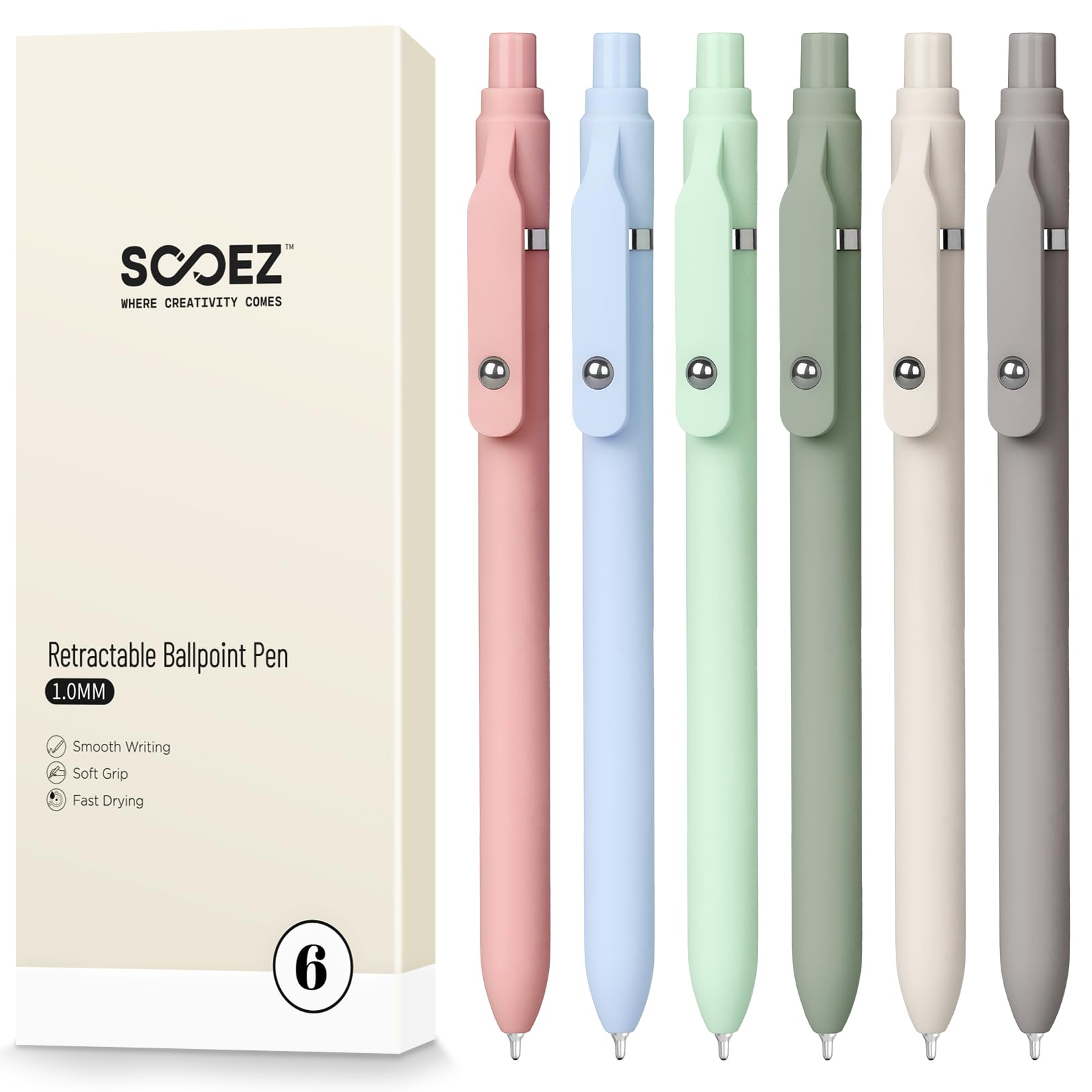 • Sooez 6 Pack Ballpoint Pens, 1.0 mm Medium Point Black Ink Pens, Smooth Writing Pen Bulk for Journaling, Soft Grip Cute Pen for Women, Nurse, Office School Supplies, Small Teacher Gifts, Multicolor