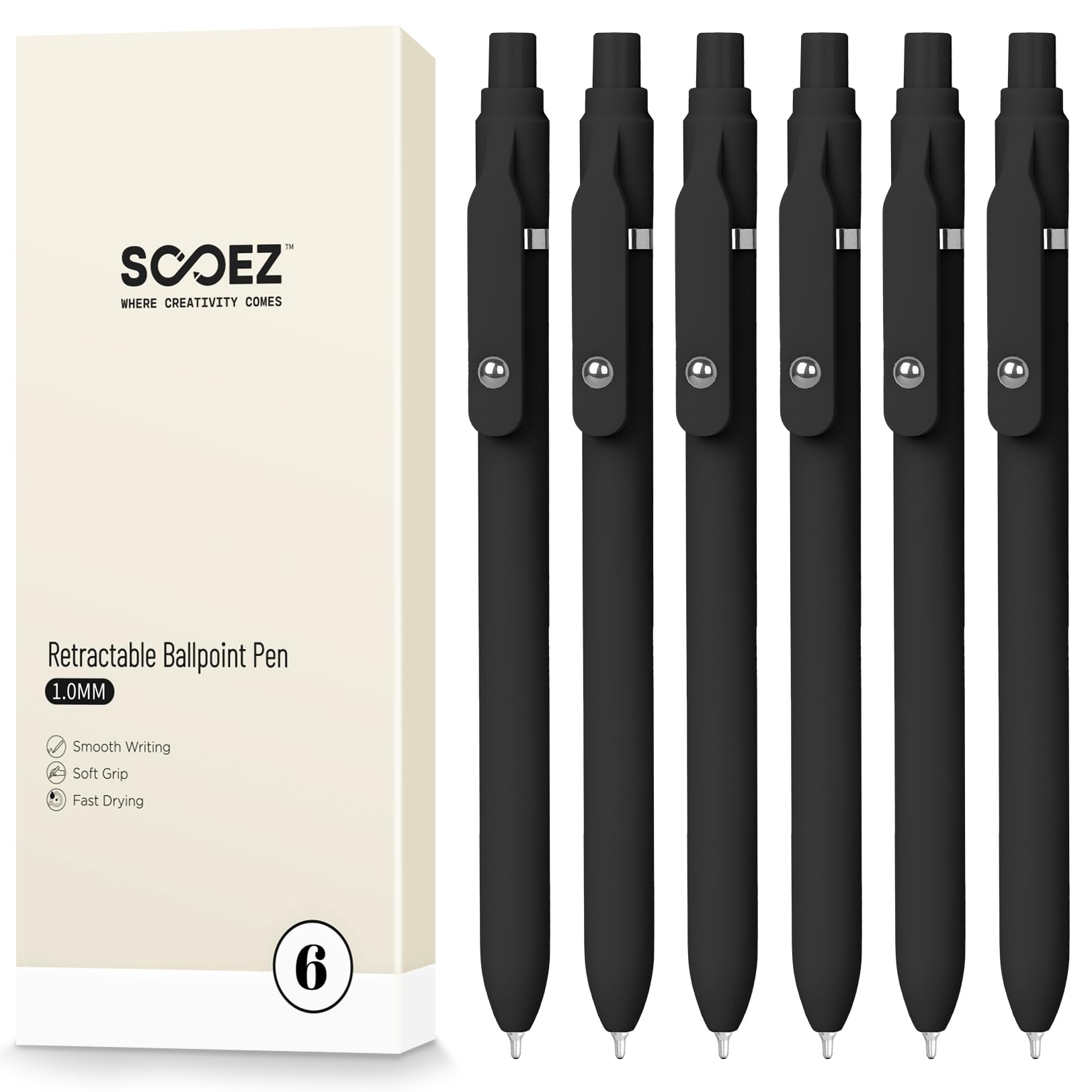 • Sooez Ballpoint Pens Retractable, 6 Pack Black Pens ballpoint with Comfort Grip, Smooth Writing Fidge Pen for Journaling, Cute Office and School Supplies Bulk Pens, 1.0mm Medium Point Black ink