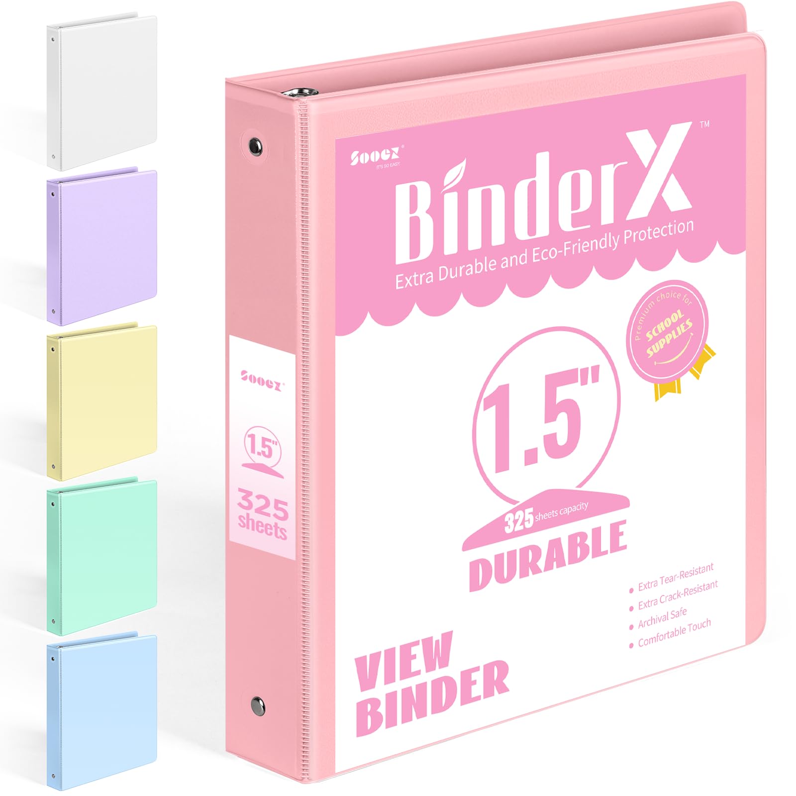 BinderX Extra Durable 1.5 Ring Binder, Round Ring 1.5 Inch Binders, Fits 325 Sheets of 8.5x11 Paper, Customizable View Cover with Inside Pockets, Cute 1.5" Binder, School Supplies for Girls, Pink