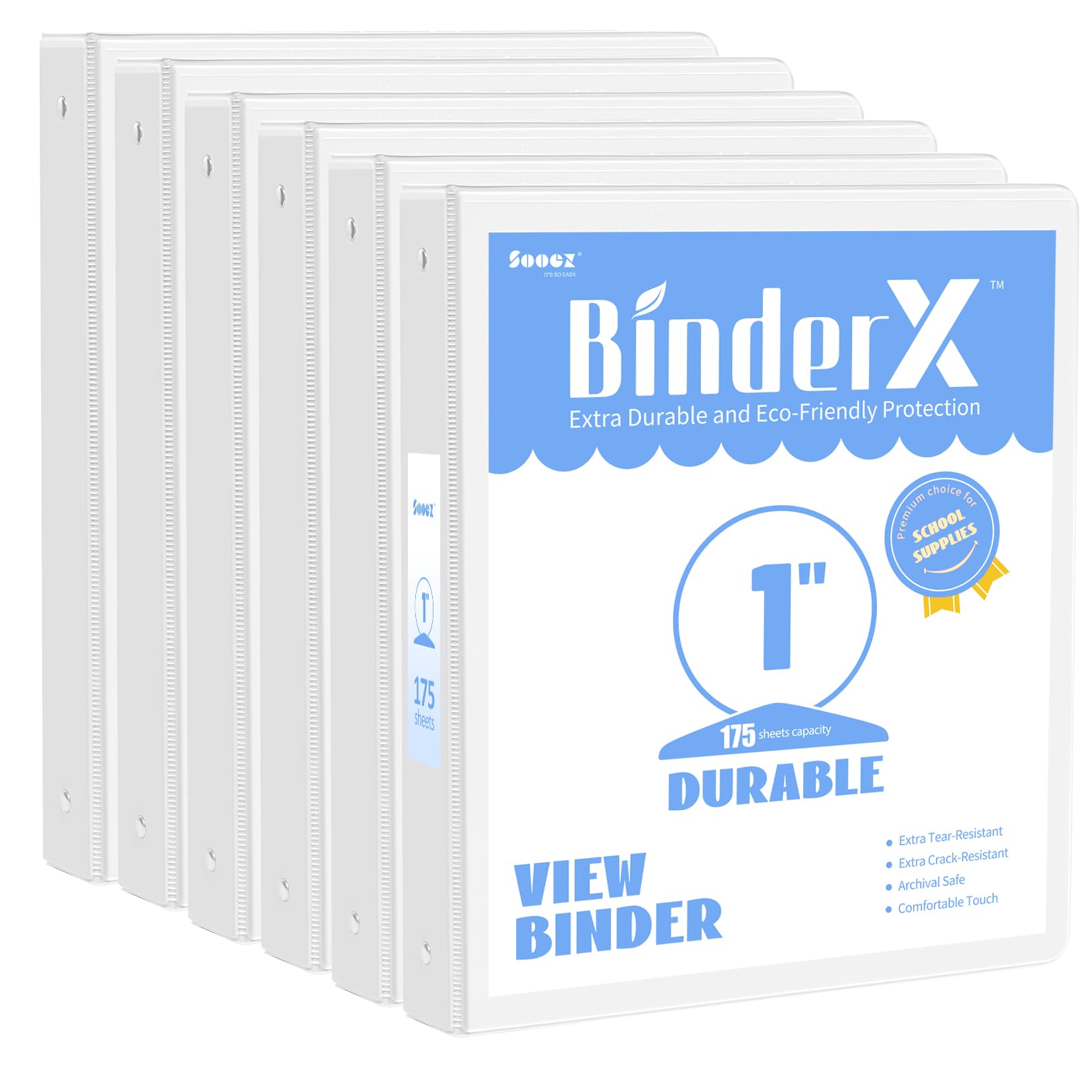 6 Pack Extra Durable 3 Ring Binders 1 inch, Sooez 1” Three Round Ring Binders with 2 Pockets, Customizable Clear View Cover for 8.5 x 11'' Letter Size Papers, White School Office Supplies for Girl