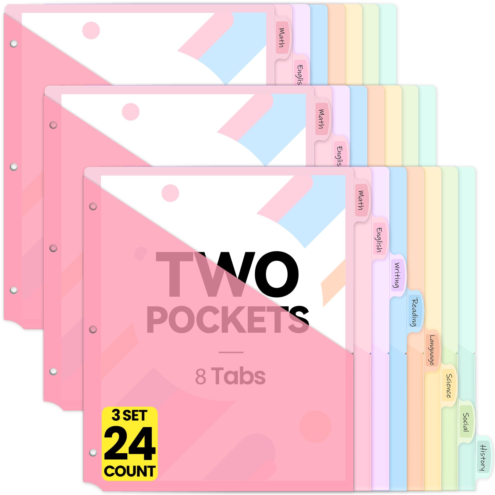 Sooez 24 Count Dividers with 2 Pockets, 8 Tabs Binder Dividers for 3 Ring Binders, Binder Dividers with tabs, Binder Divider with Pockets for US Letter Size, Insertable Big Tabs, Pastels, Set of 3