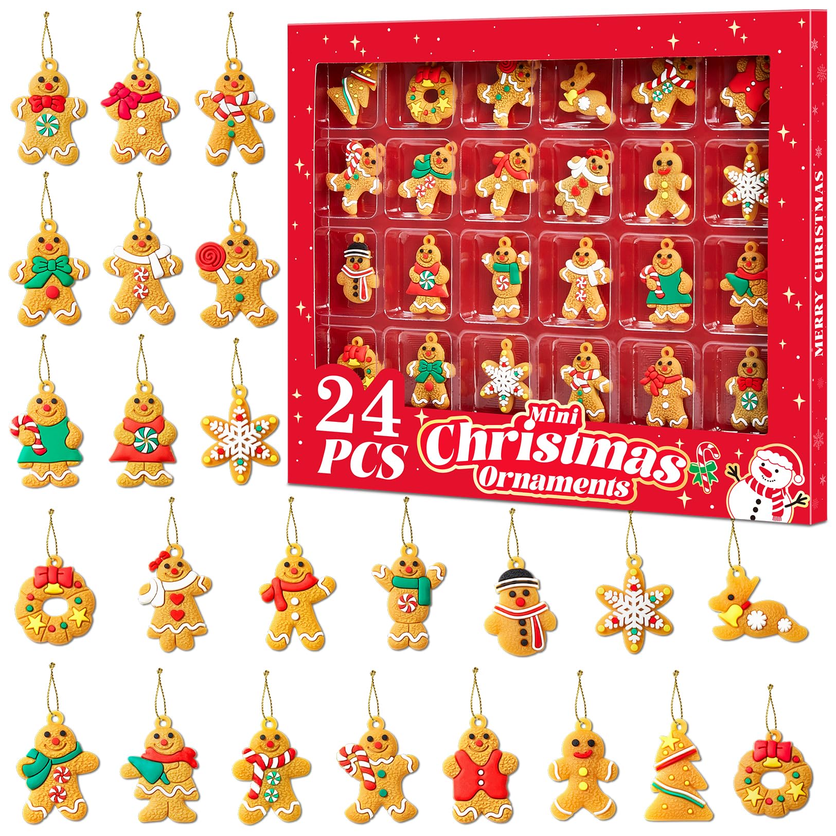 Mini Christmas Ornaments, Sooez Set of 24 Cute Miniature Gingerbread Man Tree Ornament Figures Advent Calendar Fillers, Durable & Well-Crafted Soft Rubber Figurines with Gold Loops for Easy Hanging