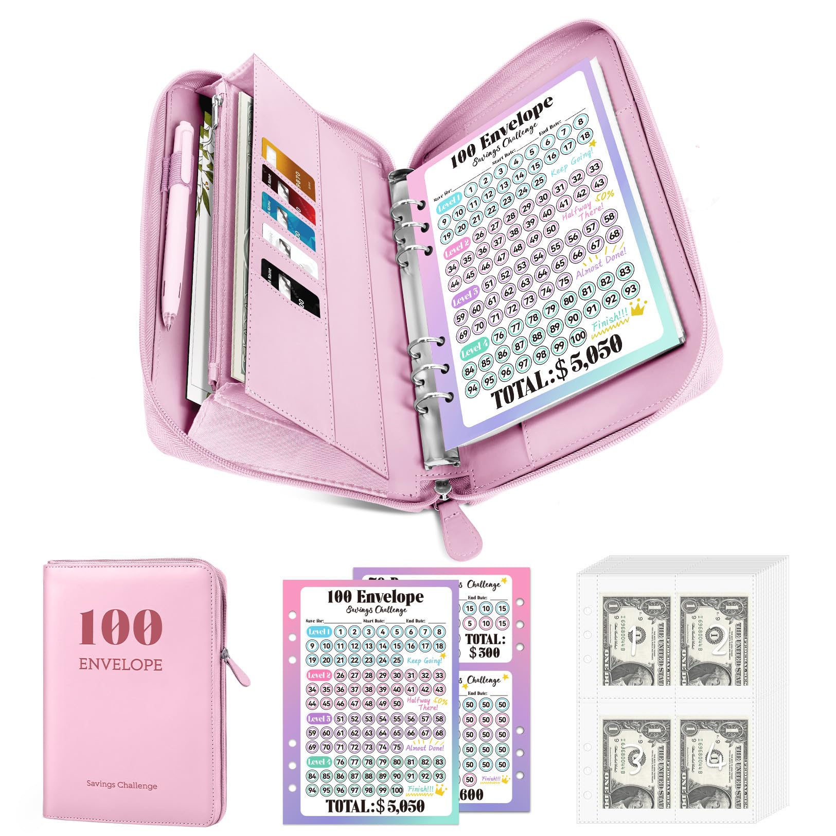 Sooez Savings Challenge Book with Extra Pocket Storage, Zipper Closure - 100 Envelopes Money Saving Challenge, PU Binder with Cash Envelope & Laminated Tracker for Cash Bill, 8.3'x 10.5', Pink