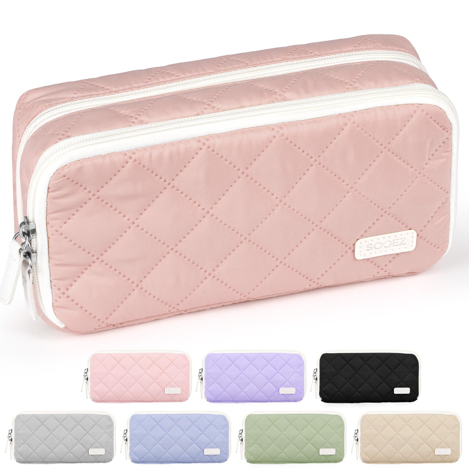 Sooez Large Pencil Case Pouch, Extra Big Pencil Bag with 8 Compartments, Pen Bag Wide Opening, Soft Quilted Pencil Pouch Organizer with Zipper, Portable Pencil Case for Teen Girls, Blush