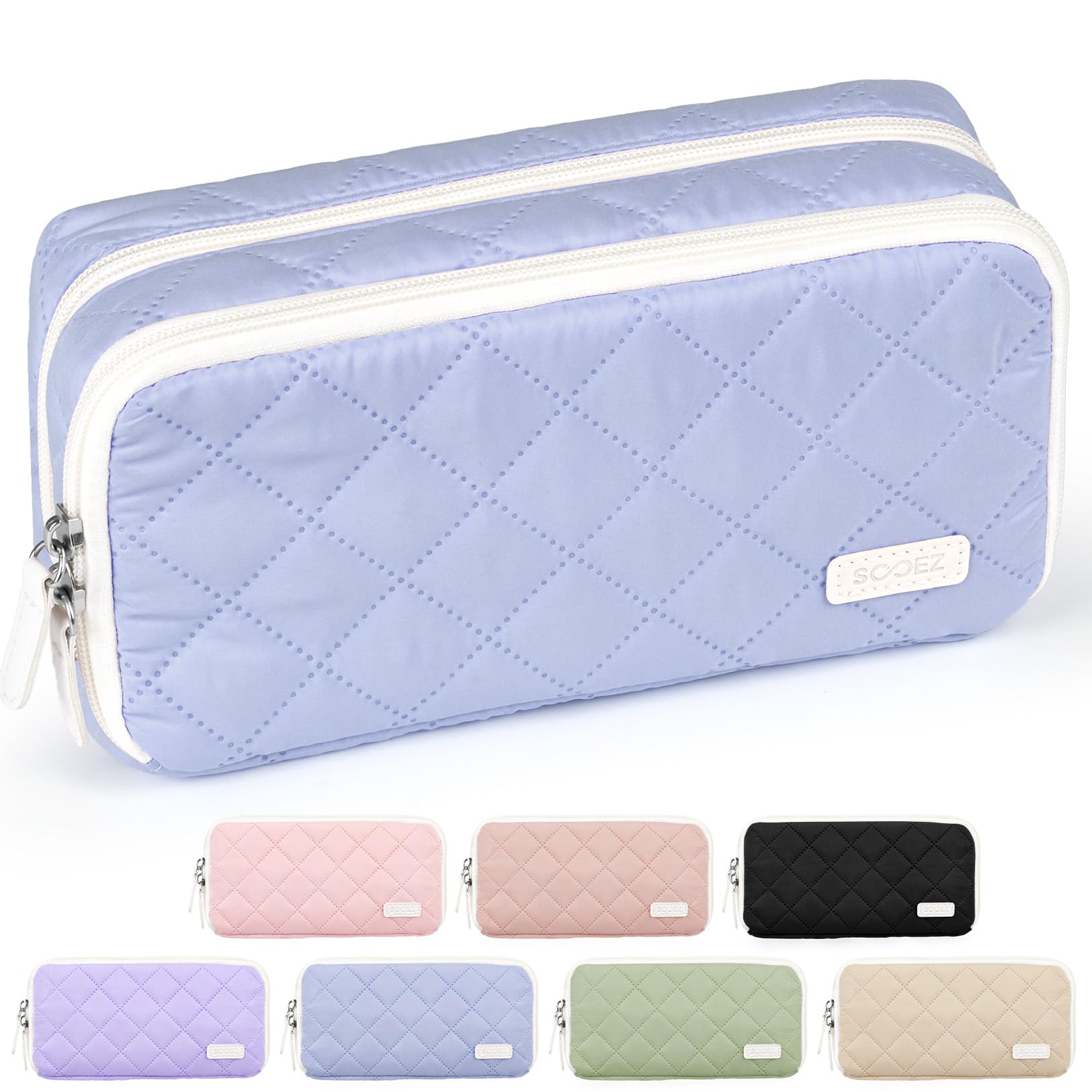 Sooez Large Pencil Case Pouch, Extra Big Pencil Bag with 8 Compartments, Pen Bag Wide Opening, Soft Quilted Pencil Pouch Organizer with Zipper, Portable Pencil Case for Teen Girls, Light Blue