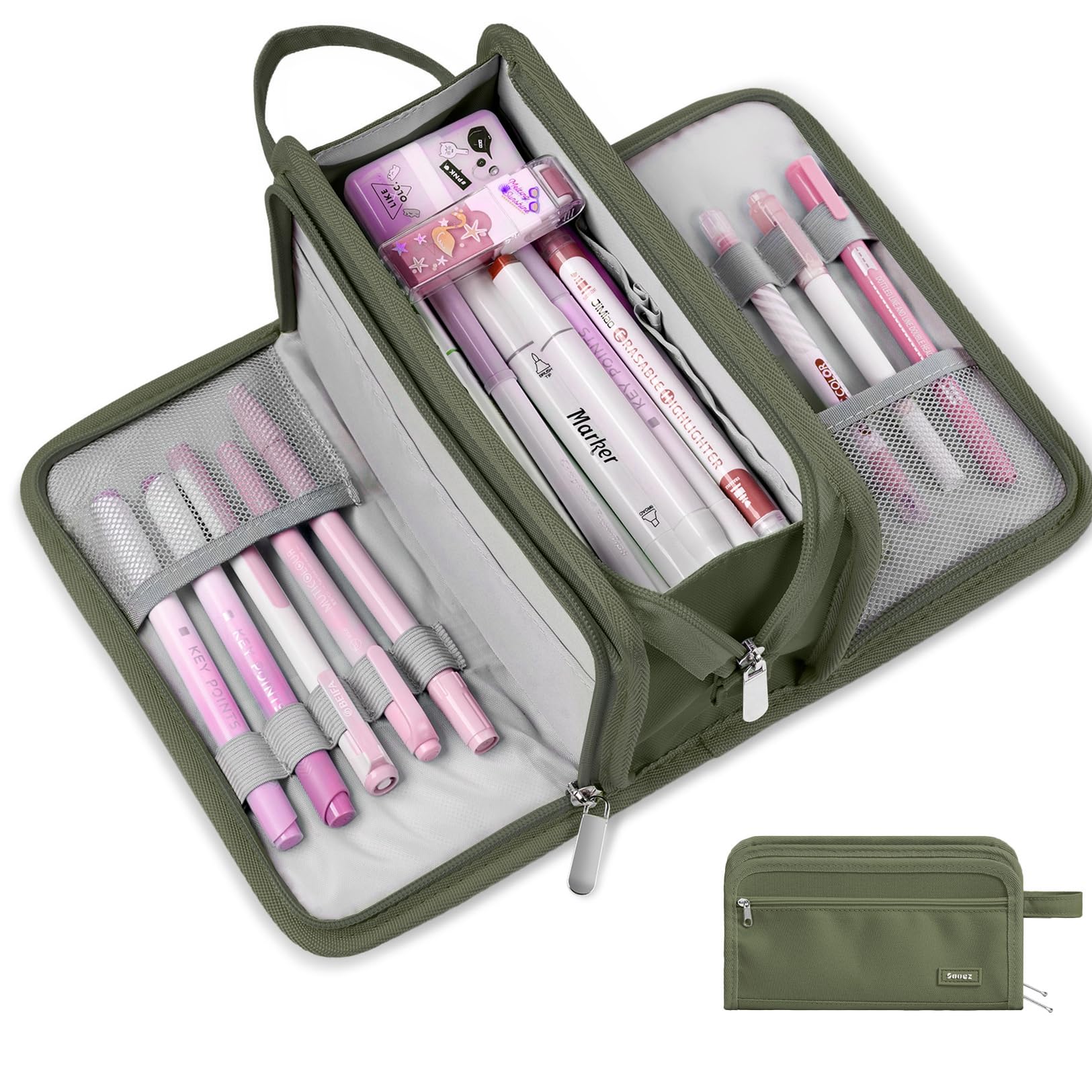 Sooez Large Pencil Case, Big Capacity Pencil Pouch Pen Bag with 3 Compartment, Portable Canvas Stationery Organizer with Zipper, Cute Aesthetic School Supplies for Teen Girls, Celadon with Plaid